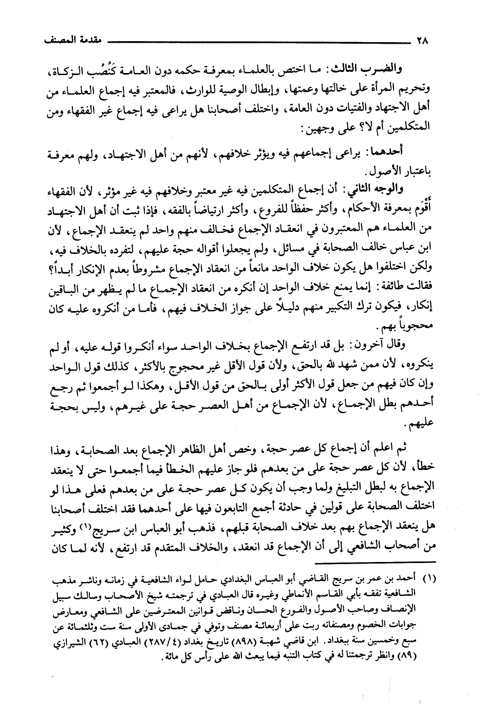 ثُمَّ اعْلَمْ أَنَّ إِجْمَاعَ كُلِّ عَصْرٍ حُجَّةٌ، وَخَصَّ أَهْلُ الظَّاهِرِ الْإِجْمَاعَ بَعْدَ الصَّحَابَةِ، وَهَذَا خَطَأٌ، لِأَنَّ كُلَّ عَصْرٍ حُجَّةٌ عَلَى مَنْ بَعْدَهُمْ فَلَوْ جَازَ عَلَيْهِمُ الْخَطَأُ فِيمَا أَجْمَعُوا حَتَّى لَا يَنْعَقِدَ الْإِجْمَاعُ بِهِ لَبَطَلَ التَّبْلِيغُ وَلَمَا وَجَبَ أَنْ يَكُونَ كُلُّ عَصْرٍ حُجَّةً عَلَى مَنْ بَعْدَهُمْ فَعَلَى هَذَا لَوِ اخْتَلَفَ الصَّحَابَةُ عَلَى قَوْلَيْنِ فِي حَادِثَةٍ أَجْمَعَ التَّابِعُونَ فِيهَا عَلَى أَحَدِهِمَا فَقَدِ اخْتَلَفَ أَصْحَابُنَا هَلْ يَنْعَقِدُ الْإِجْمَاعُ بِهِمْ بَعْدَ خِلَافِ الصَّحَابَةِ قَبْلَهُمْ، فَذَهَبَ أَبُو الْعَبَّاسِ ابْنُ سُرَيْجٍ وَكَثِيرٌ مِنْ أَصْحَابِ الشَّافِعِيِّ إِلَى أَنَّ الْإِجْمَاعَ قَدِ انْعَقَدَ، وَالْخِلَافَ الْمُتَقَدِّمَ قَدِ ارْتَفَعَ، لِأَنَّهُ لَمَّا كَانَ