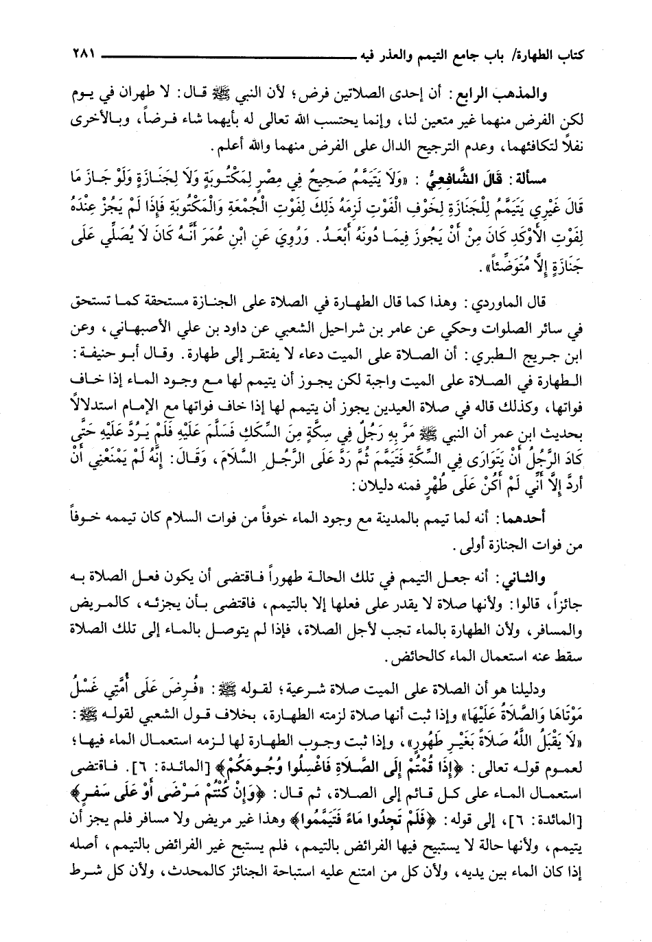 قَالَ الْمَاوَرْدِيُّ: وَهَذَا كَمَا قَالَ الطَّهَارَةُ فِي الصَّلَاةِ عَلَى الْجَنَازَةِ مُسْتَحَقَّةٌ كَمَا تُسْتَحَقُّ فِي سَائِرِ الصَّلَوَاتِ وَحُكِيَ عَنْ عَامِرِ بْنِ شَرَاحِيلَ الشعبي عن دَاوُدَ بْنِ عَلِيٍّ الْأَصْبَهَانِيِّ، وَعَنِ ابْنِ جُرَيْجٍ الطَّبَرِيِّ: أَنَّ الصَّلَاةَ عَلَى الْمَيِّتِ دُعَاءٌ لَا يَفْتَقِرُ إِلَى طَهَارَةٍ. وَقَالَ أبو حنيفة: الطَّهَارَةُ فِي الصَّلَاةِ عَلَى الْمَيِّتِ وَاجِبَةٌ لَكِنْ يَجُوزُ أَنْ يَتَيَمَّمَ لَهَا مَعَ وُجُودِ الْمَاءِ إِذَا خَافَ فَوَاتَهَا، وَكَذَلِكَ قَالَهُ فِي صَلَاةِ الْعِيدَيْنِ يَجُوزُ أَنْ يَتَيَمَّمَ لَهَا إِذَا خَافَ فَوَاتَهَا مَعَ الْإِمَامِ اسْتِدْلَالًا بِحَدِيثِ ابْنِ عُمَرَ أَنَّ النَّبِيَّ - صَلَّى اللَّهُ عَلَيْهِ وَسَلَّم َ - مَرَّ بِهِ رجلٌ فِي سكةٍ مِنَ السِّكَكِ فَسَلَّمَ عَلَيْهِ فَلَمْ يَرُدَّ عَلَيْهِ حَتَّى كَادَ الرَّجُلُ أَنْ يَتَوَارَى فِي السِّكَّةِ فَتَيَمَّمَ ثُمَّ رَدَّ عَلَى الرَّجُلِ السَّلَامَ، وَقَالَ: إِنَّهُ لَمْ يَمْنَعْنِي أَنْ أَرُدَّ إِلَّا أَنِّي لَمْ أَكُنْ عَلَى طُهْرٍ فَمِنْهُ دَلِيلَانِ: