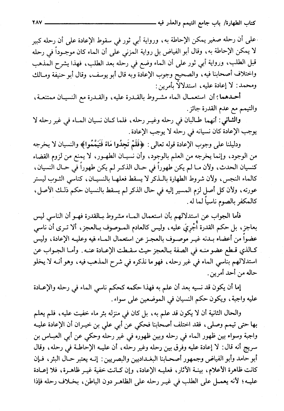 فَأَمَّا الْجَوَابُ عَنِ اسْتِدْلَالِهِمْ بِأَنَّ اسْتِعْمَالَ الْمَاءِ مَشْرُوطٌ بِالْقُدْرَةِ فَهُوَ أَنَّ النَّاسِيَ لَيْسَ بعاجزٍ، بَلْ حُكْمُ الْقُدْرَةِ أُجْرِيَ عَلَيْهِ، وَلَيْسَ كَالْعَادِمِ الْمَوْصُوفِ بِالْعَجْزِ، ألا ترى أن ناسي عضواً مِنْ أَعْضَاءِ بَدَنِهِ غَيْرُ مَوْصُوفٍ بِالْعَجْزِ عَنِ اسْتِعْمَالِ الْمَاءِ فِيهِ وَعَلَيْهِ الْإِعَادَةُ، وَلَيْسَ كَالَّذِي قُطِعَ عُضْوٌ مِنْهُ فِي الصِّفَةِ بِالْعَجْزِ حَيْثُ سَقَطَتِ الْإِعَادَةُ عَنْهُ. وَأَمَّا الْجَوَابُ عَنِ اسْتِدْلَالِهِمْ بِنَاسِي الْمَاءِ فِي غَيْرِ رَحْلِهِ، فَهُوَ مَا نَذْكُرُهُ فِي شَرْحِ الْمَذْهَبِ فِيهِ، وَهُوَ أَنَّهُ لَا يَخْلُو حَالُهُ مِنْ أَحَدِ أَمْرَيْنِ.