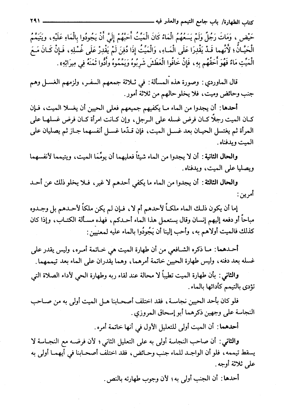 قَالَ الْمَاوَرْدِيُّ: وَصُورَةُ هَذِهِ الْمَسْأَلَةِ: فِي ثَلَاثَةٍ جَمَعَهُمُ السَّفَرُ، وَلَزِمَهُمُ الْغُسْلُ وَهُمْ جُنُبٌ وَحَائِضٌ وَمَيِّتٌ، فَلَا يَخْلُو حَالُهُمْ مِنْ ثَلَاثَةِ أُمُورٍ.