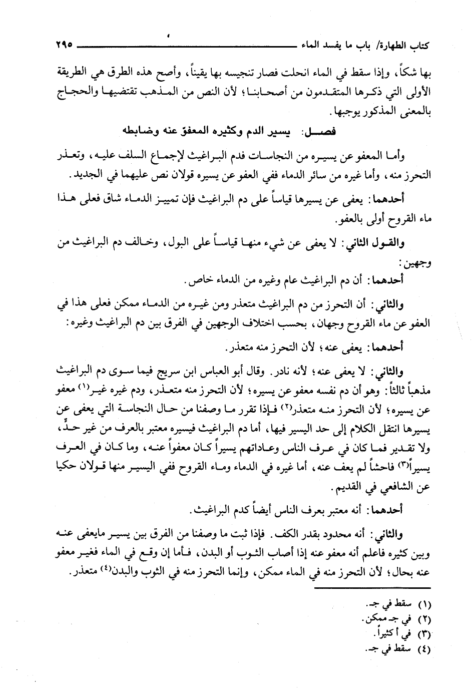 وَأَمَّا الْمَعْفُوُّ عَنْ يَسِيرِهِ مِنَ النَّجَاسَاتِ فَدَمُ الْبَرَاغِيثِ لِإِجْمَاعِ السَّلَفِ عَلَيْهِ، وَتَعَذُّرِ التَّحَرُّزِ مِنْهُ، وَأَمَّا غَيْرُهُ مِنْ سَائِرِ الدِّمَاءِ فَفِي الْعَفْوِ عَنْ يَسِيرِهِ قَوْلَانِ نَصَّ عَلَيْهِمَا فِي الْجَدِيدِ.
