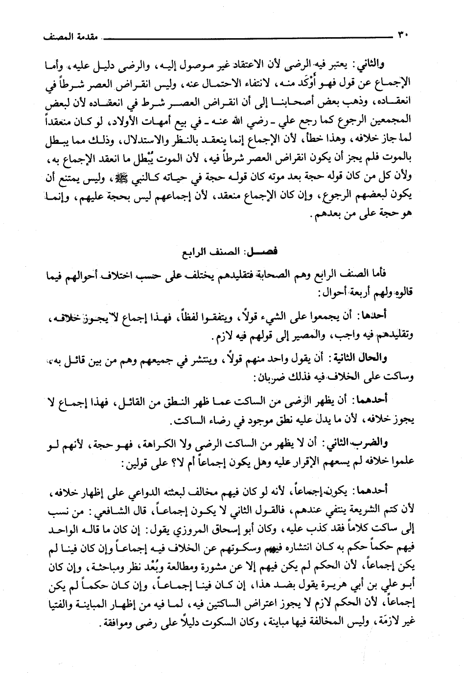 فَأَمَّا الصِّنْفُ الرَّابِعُ وَهُمُ الصَّحَابَةُ فَتَقْلِيدُهُمْ يَخْتَلِفُ عَلَى حَسَبِ اخْتِلَافِ أَحْوَالِهِمْ فِيمَا قَالُوهُ وَلَهُمْ أَرْبَعَةُ أَحْوَالٍ: