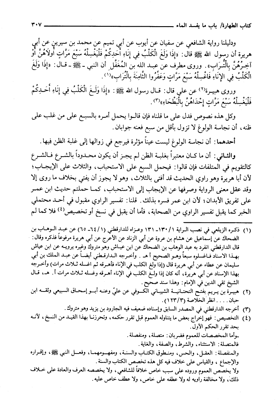 وَكُلُّ هَذِهِ نُصُوصٌ فَدَلَّ عَلَى مَا قُلْنَاهُ فَإِنْ قَالُوا يُحْمَلُ أَمْرُهُ بِالسَّبْعِ عَلَى مَنْ غَلَبَ عَلَى ظَنِّهِ، أَنَّ نَجَاسَةَ الْوُلُوغِ لَا تَزُولُ بِأَقَلَّ مِنْ سَبْعٍ فَعَنْهُ جَوَابَانِ.