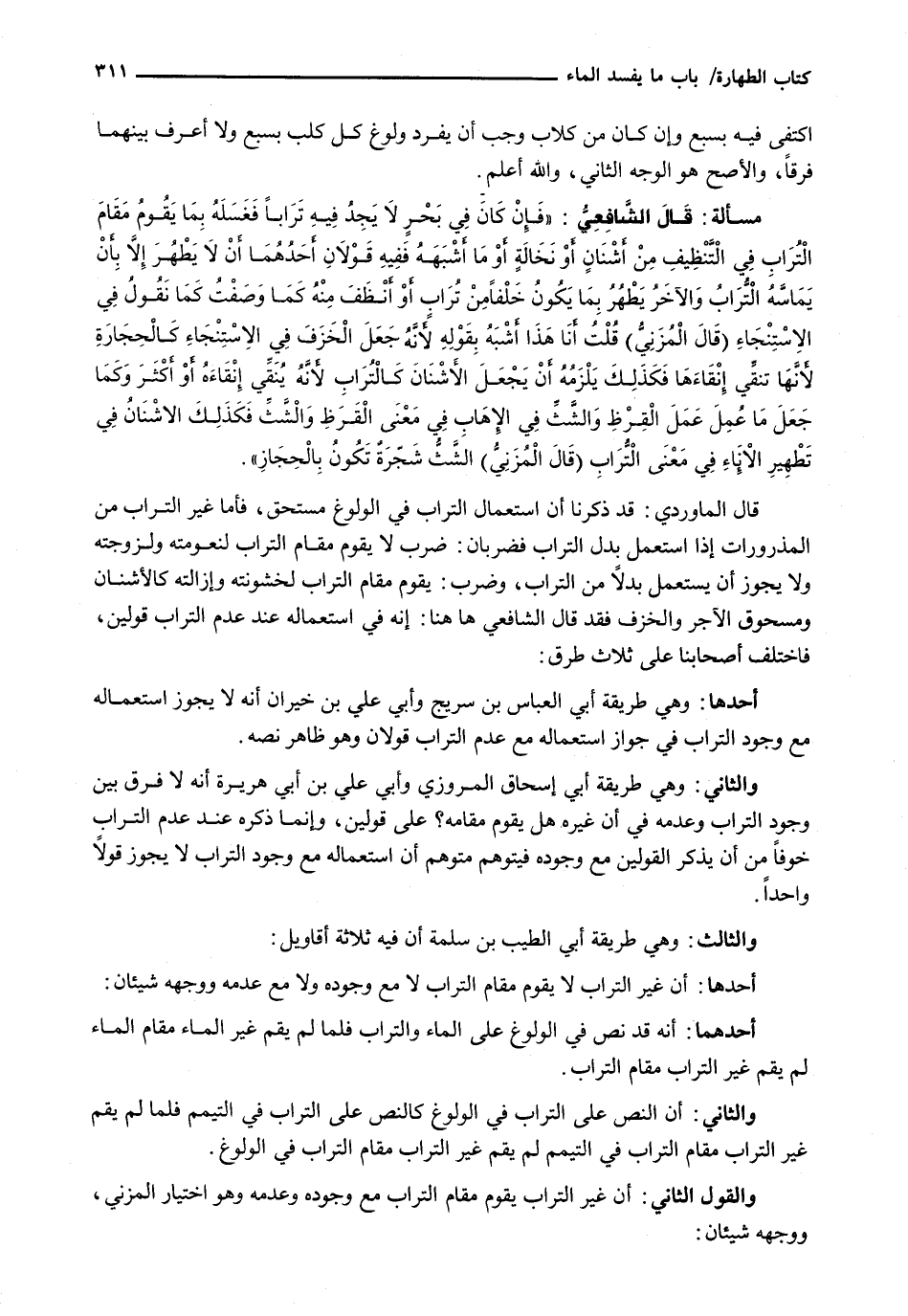 أَحَدُهَا: وَهِيَ طَرِيقَةُ أَبِي الْعَبَّاسِ بْنِ سُرَيْجٍ وَأَبِي عَلِيِّ بْنِ خَيْرَانَ إِنَّهُ لَا يَجُوزُ اسْتِعْمَالُهُ مَعَ وُجُودِ التُّرَابِ فِي جَوَازِ اسْتِعْمَالِهِ مَعَ عَدَمِ التُّرَابِ قَوْلَانِ وَهُوَ ظَاهِرُ نَصِّهِ.