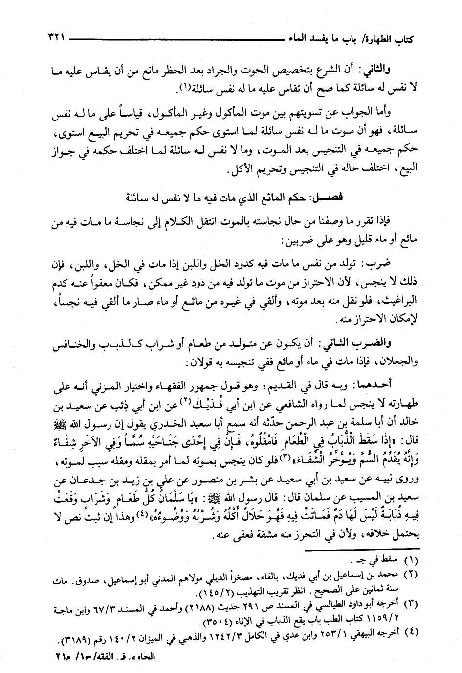 أَحَدُهُمَا: وَبِهِ قَالَ فِي الْقَدِيمِ؛ وَهُوَ قَوْلُ جُمْهُورِ الْفُقَهَاءِ وَاخْتِيَارُ الْمُزَنِيِّ أَنَّهُ عَلَى طَهَارَتِهِ لَا يُنَجِّسُ لِمَا رَوَاهُ الشَّافِعِيُّ عَنِ ابْنِ أَبِي فُدَيْكٍ عَنِ ابْنِ أَبِي ذِئْبٍ عَنْ سَعِيدِ بْنِ خَالِدٍ أَنَّ أَبَا سَلَمَةَ بْنَ عَبْدِ الرَّحْمَنِ حَدَّثَهُ أَنَّهُ سَمِعَ أَبَا سَعِيدٍ الْخُدْرِيَّ يَقُولُ إِنَّ رَسُولَ اللَّهِ - صَلَّى اللَّهُ عَلَيْهِ وَسَلَّم َ - قَالَ: " إِذَا سَقَطَ الذُّبَابُ فِي الطَّعَامِ فَامْقُلُوهُ، فَإِنَّ فِي إِحْدَى جَنَاحَيْهِ سُمًّا وَفِي الْآخَرِ شفاءٌ وَإِنَهُ يُقَدِّمُ السُّمَّ وَيُؤَخِّرُ الْشِّفَاءَ " فَلَوْ كَانَ يُنَجِّسُ بِمَوْتِهِ لَمَا أَمَرَ بِمَقْلِهِ وَمَقْلُهُ سَبَبٌ لِمَوْتِهِ، وَرَوَى نَبِيهٌ عَنْ سَعِيدِ بْنِ أَبِي سَعِيدٍ عَنْ بِشْرِ بْنِ مَنْصُورٍ عَنْ عَلِيِّ بْنِ زَيْدِ بْنِ جُدْعَانَ عَنْ سَعِيدِ بْنِ الْمُسَيَّبِ عَنْ سَلْمَانَ قَالَ: قَالَ رَسُولُ اللَّهِ - صَلَّى اللَّهُ عَلَيْهِ وَسَلَّم َ -: " يَا سَلْمَانُ كُلُّ طعامٍ وشرابٍ وَقَعَتْ فِيهِ ذبابةٌ لَيْسَ لَهَا دمٌ فَمَاتَتْ فِيهِ فَهُوَ حلالٌ أَكْلُهُ وَشُرْبُهُ وَوُضُوءُهُ " وَهَذَا إِنْ ثَبَتَ نَصٌّ لَا يَحْتَمِلُ خِلَافَهُ، وَلِأَنَّ فِي التَّحَرُّزِ مِنْهُ مَشَقَّةً فَعُفِيَ عَنْهُ.