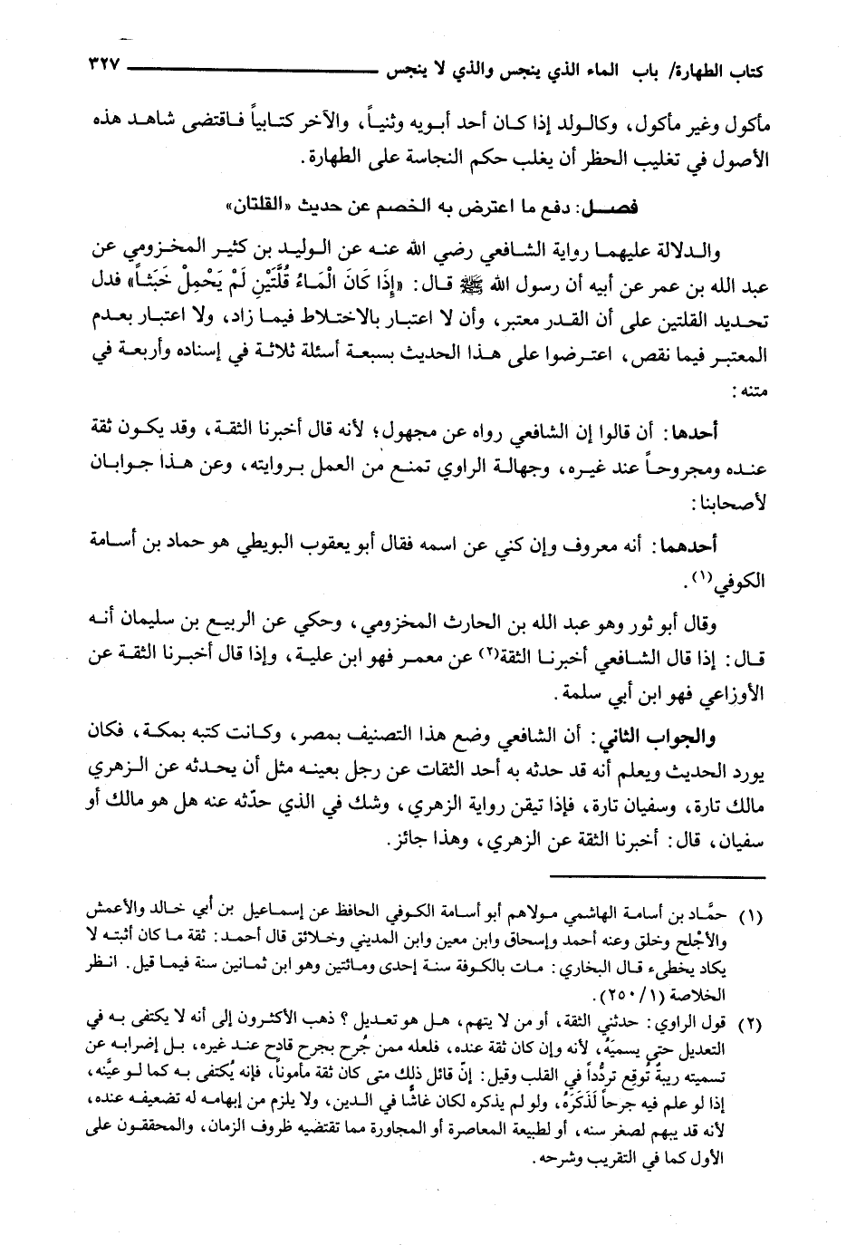 وَالدَّلَالَةُ عَلَيْهِمَا رِوَايَةُ الشَّافِعِيِّ رَضِيَ اللَّهُ عَنْهُ عَنِ الْوَلِيدِ بْنِ كَثِيرٍ الْمَخْزُومِيِّ عَنْ عَبْدِ اللَّهِ بْنِ عُمَرَ عَنْ أَبِيهِ أَنَّ رَسُولَ اللَّهِ - صَلَّى اللَّهُ عَلَيْهِ وَسَلَّم َ - قَالَ: " إِذَا كَانَ الْمَاءُ قُلَّتَيْنِ لَمْ يَحْمِلْ خَبَثًا " فَدَلَّ تَحْدِيدُ الْقُلَّتَيْنِ عَلَى أَنَّ الْقَدْرَ مُعْتَبَرٌ، وَأَنْ لَا اعْتِبَارَ بِالِاخْتِلَاطِ فِيمَا زَادَ، ولا اعتبار بعدم المعتبر فيما نقص، اعترضوا عَلَى هَذَا الْحَدِيثِ بِسَبْعَةِ أَسْئِلَةٍ ثَلَاثَةٍ فِي إسناده وأربعة في متنه: