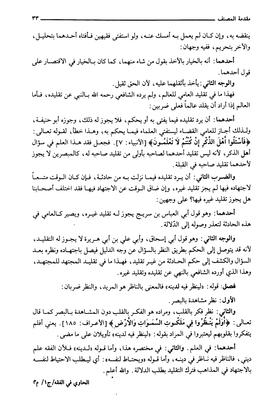 أحدهما: أن يرد تَقْلِيدَهُ فِيمَا يُفْتَى بِهِ أَوْ يُحْكَمُ، فَلَا يَجُوزُ لَهُ ذَلِكَ، وَجَوَّزَهُ أبو حنيفة، وَلِذَلِكَ أَجَازَ لِلْعَامِّيِّ الْقَضَاءَ لِيَسْتَفْتِيَ الْعُلَمَاءَ فِيمَا يَحْكُمُ به، وهذا خطأ، لقوله تعالى: {فاسئلوا أَهْلَ الذِّكْرِ إِنْ كُنْتُمْ لا تَعْلَمُونَ} [الأنبياء: 7] . فجعل فقد هذا الْعِلْمِ فِي سُؤَالِ أَهْلِ الذِّكْرِ، لِأَنَّهُ لَيْسَ تَقْلِيدُ أَحَدِهِمَا لِصَاحِبِهِ بِأَوْلَى مِنْ تَقْلِيدِ صَاحِبِهِ له، كالمبصرين لَا يَجُوزُ لِأَحَدِهِمَا تَقْلِيدُ صَاحِبِهِ فِي الْقِبْلَةِ.