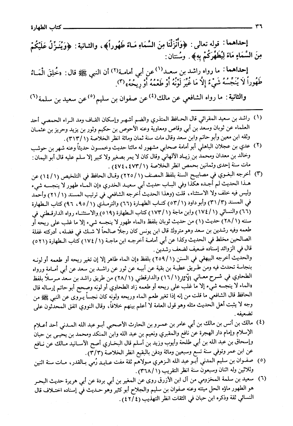 إِحْدَاهُمَا: مَا رَوَاهُ رَاشِدُ بْنُ سَعْدٍ عَنْ أَبِي أُمَامَةَ أَنَّ النَّبِيَّ - صَلَّى اللَّهُ عَلَيْهِ وَسَلَّم َ - قَالَ: " خُلِقَ الْمَاءُ طَهُورًا لَا يُنَجِّسُهُ شَيْءٌ إِلَّا مَا غَيَّرَ لَوْنَهُ أَوْ طَعْمَهُ أَوْ رِيحَهُ ".
