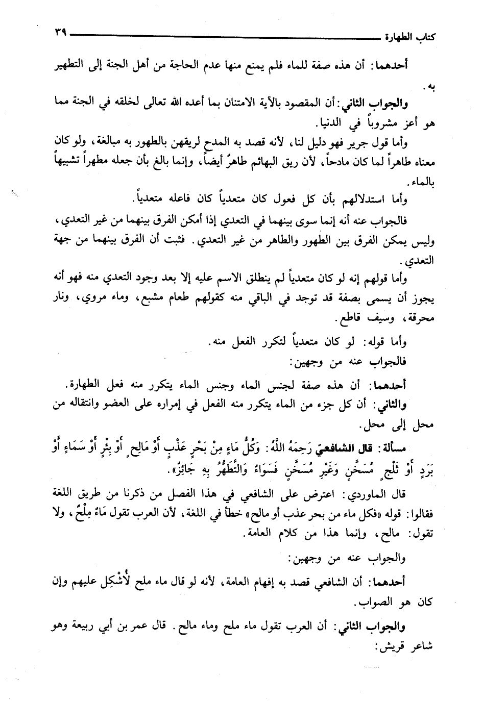 قَالَ الْمَاوَرْدِيُّ: اعْتَرَضَ عَلَى الشَّافِعِيِّ فِي هَذَا الْفَصْلِ مَنْ ذَكَرْنَا مِنْ طَرِيقِ اللُّغَةِ فَقَالُوا: قَوْلُهُ " فَكُلُّ مَاءٍ مِنْ بَحْرٍ عَذْبٍ أَوْ مَالِحٍ " خَطَأٌ فِي اللُّغَةِ، لِأَنَّ الْعَرَبَ تَقُولُ مَاءٌ مِلْحٌ، وَلَا تَقُولُ: مَالِحٌ، وَإِنَّمَا هَذَا مِنْ كَلَامِ الْعَامَّةِ.