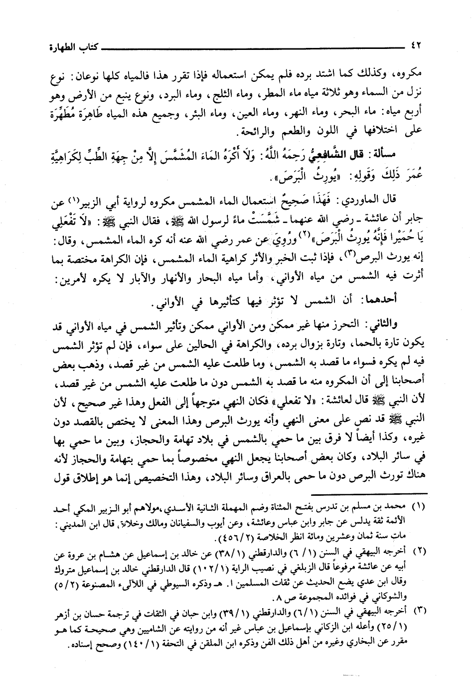 قَالَ الشَّافِعِيُّ رَحِمَهُ اللَّهُ: وَلَا أَكْرَهُ الْمَاءَ الْمُشَمَّسَ إِلَّا مِنْ جِهَةِ الطِّبِّ لِكَرَاهِيَةِ عُمْرَ ذَلِكَ وَقَوْلِهِ: " يُورِثُ الْبَرَصَ ".