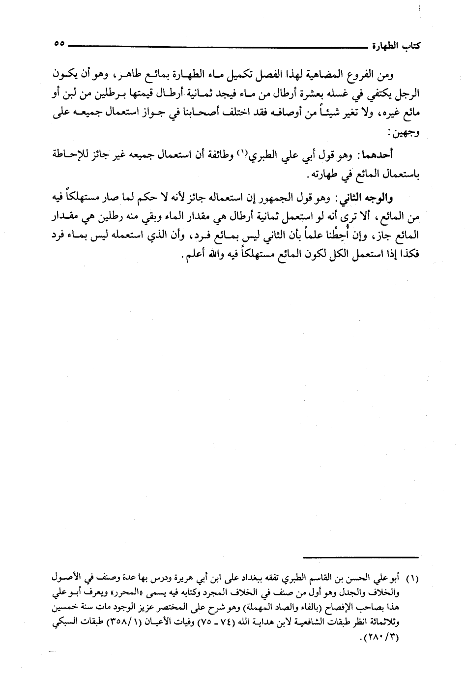 أَحَدُهُمَا: وَهُوَ قَوْلُ أَبِي عَلِيٍّ الطَّبَرِيِّ وَطَائِفَةٍ أَنَّ اسْتِعْمَالَ جَمِيعِهِ غَيْرُ جَائِزٍ لِلْإِحَاطَةِ بِاسْتِعْمَالِ الْمَائِعِ فِي طَهَارَتِهِ.