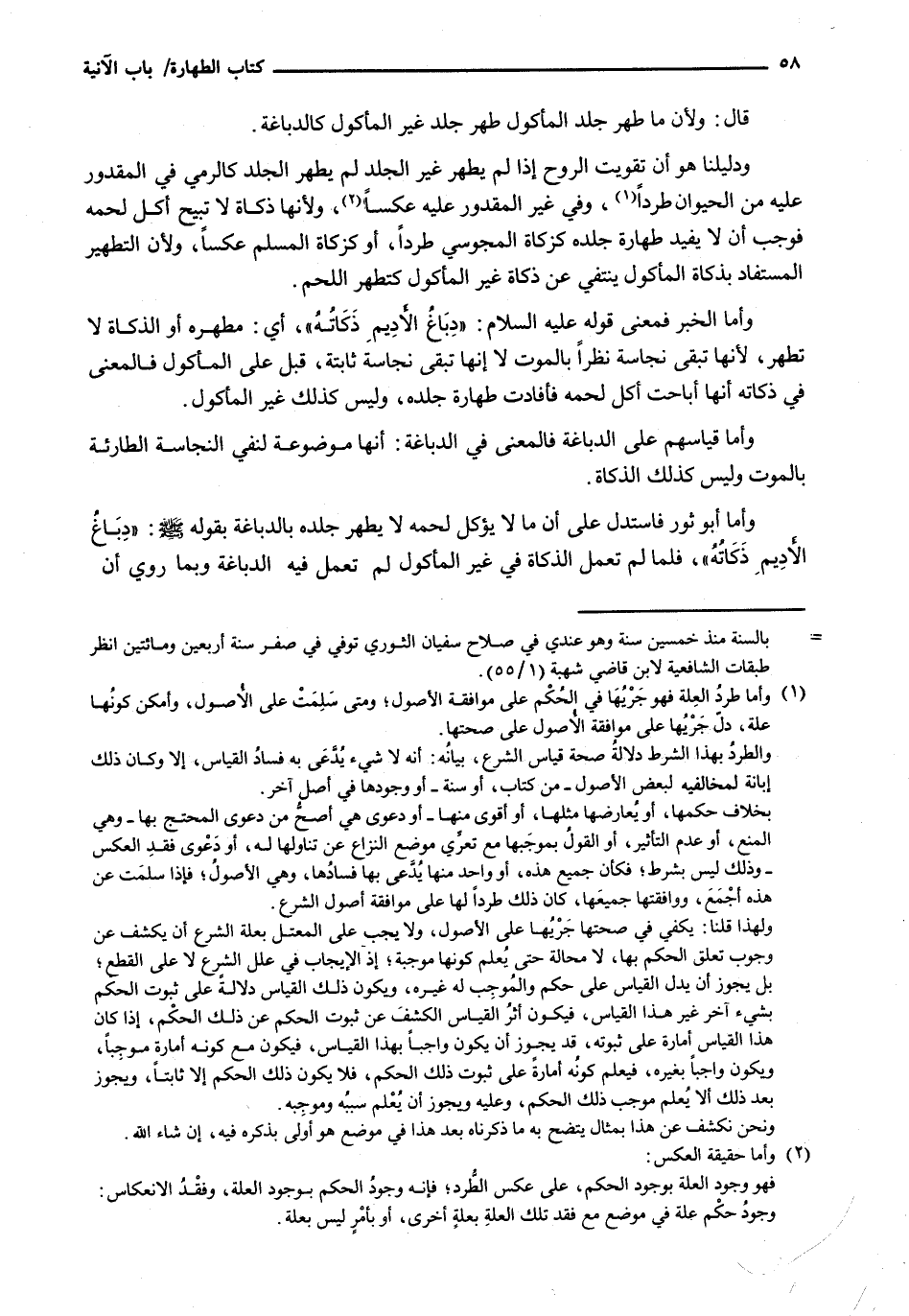 وأما الخبر فمعنى قوله عليه السلام: " دباغ الأديم ذكاته "، أي: مطهره أو الذكاة لَا تُطَهِّرُ، لِأَنَّهَا تُبْقِي نَجَاسَةً نَظَرًا بِالْمَوْتِ لا إنها تبقى نجاسة ثابتة،، قبل عَلَى الْمَأْكُولِ فَالْمَعْنَى فِي ذَكَاتِهِ أَنَّهَا أَبَاحَتْ أَكْلَ لَحْمِهِ فَأَفَادَتْ طَهَارَةَ جِلْدِهِ، وَلَيْسَ كَذَلِكَ غَيْرُ الْمَأْكُولِ.