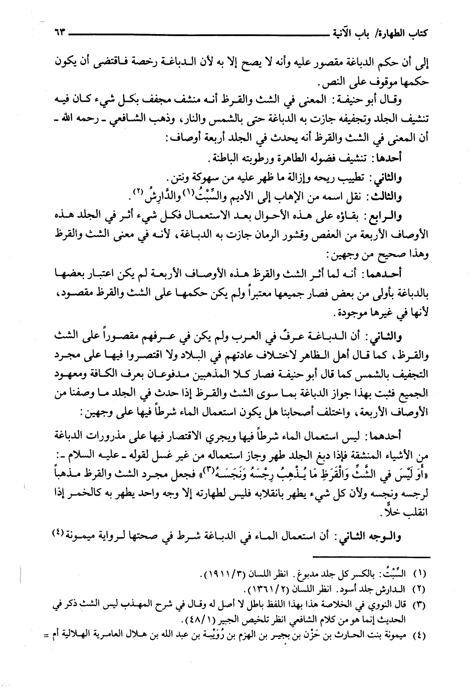 والثاني: أن الدباغة عرف في العرب ولم يكن في عرفهم مقصورا عَلَى الشَّثِّ وَالْقَرَظِ، كَمَا قَالَ أَهْلُ الظَّاهِرِ لِاخْتِلَافِ عَادَتِهِمْ فِي الْبِلَادِ وَلَا اقْتَصَرُوا فِيهَا عَلَى مُجَرَّدِ التَّجْفِيفِ بِالشَّمْسِ كَمَا قَالَ أبو حنيفة فصار كلا المذهبين مدفوعان بِعُرْفِ الْكَافَّةِ وَمَعْهُودِ الْجَمِيعِ فَثَبَتَ بِهَذَا جَوَازُ الدِّبَاغَةِ بِمَا سِوَى الشَّثِّ وَالْقَرَظِ إِذَا حَدَثَ فِي الْجِلْدِ مَا وَصَفْنَا مِنَ الْأَوْصَافِ الْأَرْبَعَةِ، وَاخْتَلَفَ أَصْحَابُنَا هَلْ يَكُونُ اسْتِعْمَالُ الْمَاءِ شَرْطًا فِيهَا عَلَى وَجْهَيْنِ: