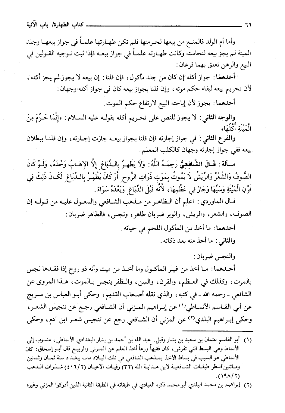 أَحَدُهُمَا: مَا أُخِذَ من غير المأكول وما أخذ من ميت وأنه ذُو رُوحٍ إِذَا فَقَدَهَا نَجِسَ بِالْمَوْتِ، وَكَذَلِكَ فِي الْعَظْمِ، وَالْقَرْنِ، وَالسِّنِّ، وَالظُّفُرِ يَنْجَسُ بِالْمَوْتِ، هَذَا الْمَرْوِيُّ عَنِ الشَّافِعِيِّ - رَحِمَهُ اللَّهُ - فِي كتبه، والذي نقله أصحاب الْقَدِيمِ، وَحَكَى أَبُو الْعَبَّاسِ بْنُ سُرَيْجٍ عَنْ أَبِي الْقَاسِمِ الْأَنْمَاطِيِّ عَنْ إِبْرَاهِيمَ الْمُزَنِيِّ أَنَّ الشافعي رجع عن تنجيس الشعر، وحكى إِبْرَاهِيمُ الْبَلَدِيُّ عَنِ الْمُزَنِيِّ أَنَّ الشَّافِعِيَّ رَجَعَ عَنْ تَنْجِيسِ شَعْرِ ابن آدم، وحكى