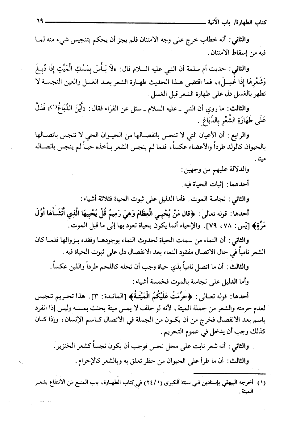 وَالثَّانِي: نَجَاسَةُ الْمَوْتِ. فَأَمَّا الدَّلِيلُ عَلَى ثبوت الحياة فثلاثة أشياء: