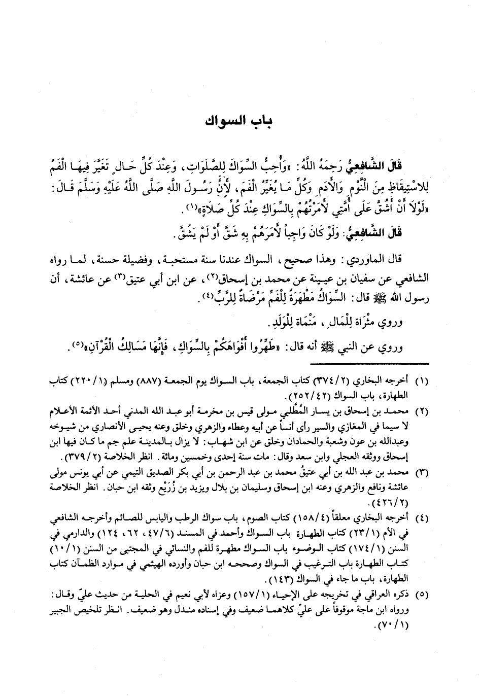 قال الْمَاوَرْدِيُّ: وَهَذَا صَحِيحٌ، السِّوَاكُ عِنْدَنَا سُنَّةٌ مُسْتَحَبَّةٌ، وَفَضِيلَةٌ حَسَنَةٌ، لِمَا رَوَاهُ الشَّافِعِيُّ عَنْ سُفْيَانَ بْنِ عُيَيْنَةَ عَنْ مُحَمَّدِ بْنِ إِسْحَاقَ، عَنِ ابْنِ أَبِي عَتِيقٍ عَنْ عَائِشَةَ، أَنَّ رَسُولَ اللَّهِ - صَلَّى اللَّهُ عَلَيْهِ وَسَلَّم َ - قَالَ: السِّوَاكُ مَطْهَرَةٌ لِلْفَمِ مَرْضَاةٌ لِلرَّبِّ.