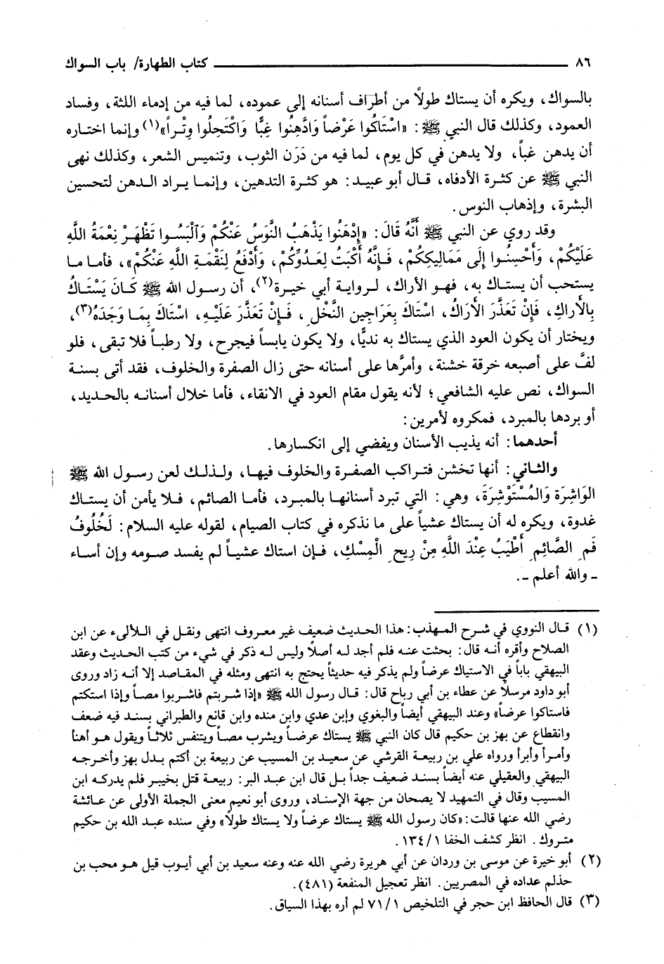بِالسِّوَاكِ، وَيَكْرَهُ أَنْ يَسْتَاكَ طُولًا مِنْ أَطْرَافِ أَسْنَانِهِ إِلَى عَمُودِهِ، لِمَا فِيهِ مِنْ إِدْمَاءِ اللثة، وفساد الْعَمُودِ، وَكَذَلِكَ قَالَ النَّبِيُّ - صَلَّى اللَّهُ عَلَيْهِ وَسَلَّم َ -: " اسْتَاكُوا عَرْضًا وَادَّهِنُوا غِبًّا وَاكْتَحِلُوا وِتْرًا ". وَإِنَّمَا اخْتَارَهُ أَنْ يَدَّهِنَ غِبًّا، وَلَا يَدَّهِنُ فِي كُلِّ يَوْمٍ، لِمَا فِيهِ مِنْ دَرَنِ الثَّوْبِ، وَتَنْمِيسِ الشَّعْرِ، وَكَذَلِكَ نَهَى النَّبِيُّ - صَلَّى اللَّهُ عَلَيْهِ وَسَلَّم َ - عَنْ كَثْرَةِ الْأَدْفَاهِ، قَالَ أَبُو عُبَيْدٍ: هُوَ كَثْرَةُ التَّدْهِينِ، وَإِنَّمَا يُرَادُ الدُّهْنُ لِتَحْسِينِ الْبَشَرَةِ، وَإِذْهَابِ النَّوْسِ.