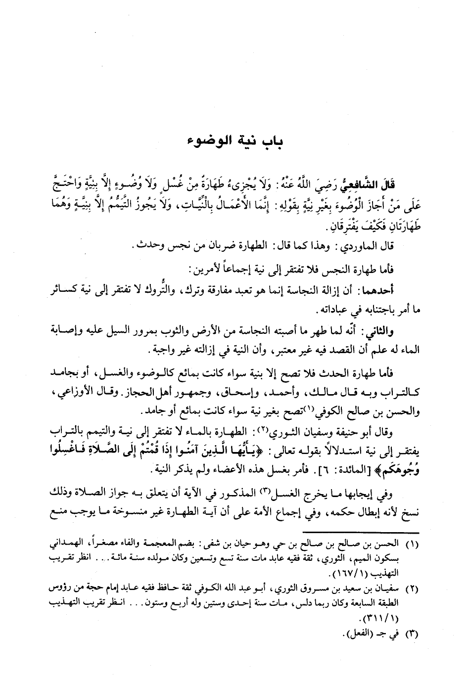 فَأَمَّا طَهَارَةُ الْحَدَثِ فَلَا تَصِحُّ إِلَّا بِنِيَّةٍ سَوَاءٌ كَانَتْ بِمَائِعٍ كَالْوُضُوءِ وَالْغُسْلِ، أَوْ بِجَامِدٍ كَالتُّرَابِ وَبِهِ قَالَ مَالِكٌ، وَأَحْمَدُ، وَإِسْحَاقُ، وَجُمْهُورُ أَهْلِ الْحِجَازِ. وَقَالَ الْأَوْزَاعِيُّ، وَالْحَسَنُ بْنُ صَالِحٍ الْكُوفِيُّ تَصِحُّ بِغَيْرِ نِيَّةٍ سَوَاءٌ كَانَتْ بِمَائِعٍ أَوْ جَامِدٍ.