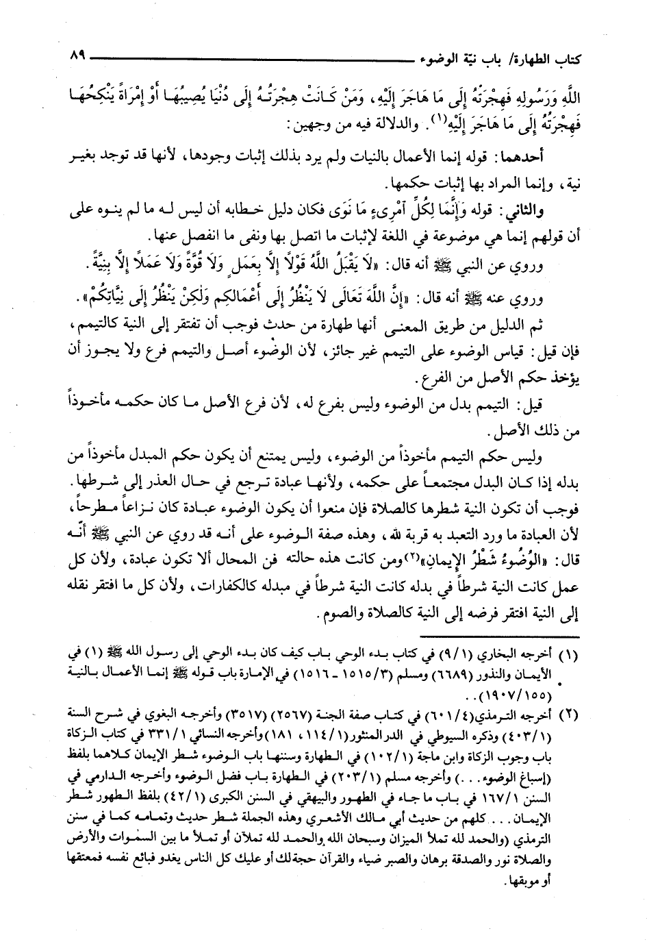 أَحَدُهُمَا: قَوْلُهُ إِنَّمَا الْأَعْمَالُ بِالنِّيَّاتِ وَلَمْ يُرِدْ بِذَلِكَ إِثْبَاتَ وُجُودِهَا، لِأَنَّهَا قَدْ تُوجَدُ بِغَيْرِ نِيَّةٍ، وَإِنَّمَا الْمُرَادُ بِهَا إِثْبَاتُ حُكْمِهَا.