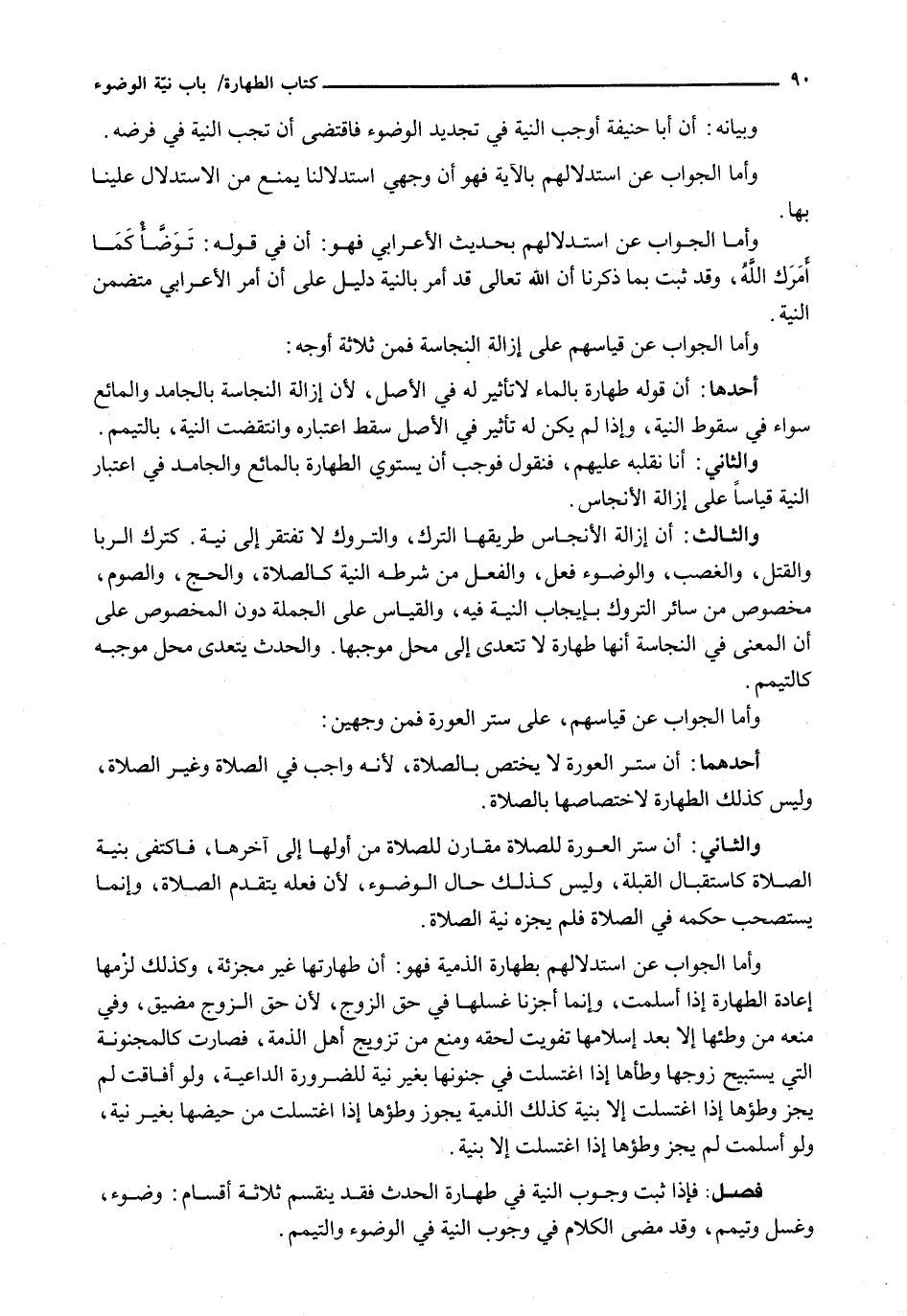 وَالثَّالِثُ: أَنَّ إِزَالَةَ الْأَنْجَاسِ طَرِيقُهَا التَّرْكُ، وَالتُّرُوكُ لَا تَفْتَقِرُ إِلَى نِيَّةٍ. كَتَرْكِ الرِّبَا وَالْقَتْلِ، وَالْغَصْبِ، وَالْوُضُوءُ فِعْلٌ، وَالْفِعْلُ مِنْ شَرْطِهِ النِّيَّةُ كَالصَّلَاةِ، وَالْحَجِّ، وَالصَّوْمِ، مَخْصُوصٌ مِنْ سَائِرِ التُّرُوكِ بِإِيجَابِ النِّيَّةِ فِيهِ،، وَالْقِيَاسِ عَلَى الْجُمْلَةِ دُونَ الْمَخْصُوصِ عَلَى أَنَّ الْمَعْنَى فِي النَّجَاسَةِ أَنَّهَا طَهَارَةٌ لَا تَتَعَدَّى إِلَى مَحَلِّ مُوجِبِهَا. وَالْحَدَثُ يَتَعَدَّى مَحَلَّ مُوجِبِهِ كَالتَّيَمُّمِ.