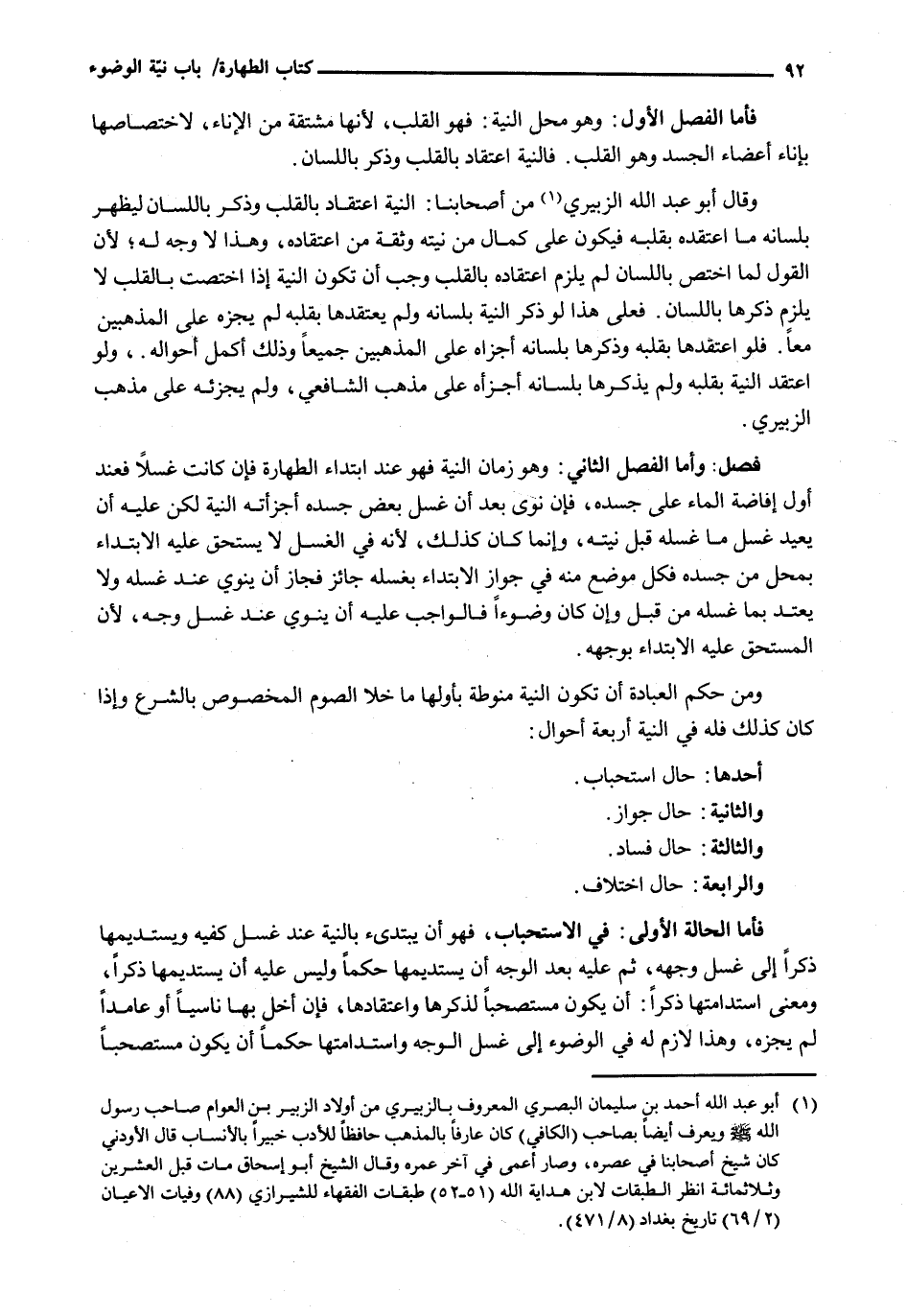 وَقَالَ أَبُو عَبْدِ اللَّهِ الزُّبَيْرِيُّ مِنْ أَصْحَابِنَا: النِّيَّةُ اعْتِقَادٌ بِالْقَلْبِ وَذِكْرٌ بِاللِّسَانِ لِيُظْهِرَ بِلِسَانِهِ مَا اعْتَقَدَهُ بِقَلْبِهِ فَيَكُونُ عَلَى كَمَالٍ مِنْ نِيَّتِهِ وَثِقَةٍ مِنَ اعْتِقَادِهِ، وَهَذَا لَا وَجْهَ لَهُ؛ لِأَنَّ الْقَوْلَ لَمَّا اخْتَصَّ بِاللِّسَانِ لَمْ يَلْزَمِ اعْتِقَادُهُ بِالْقَلْبِ وَجَبَ أَنْ تَكُونَ النِّيَّةُ إِذَا اخْتَصَّتْ بِالْقَلْبِ لَا يَلْزَمْ ذِكْرُهَا بِاللِّسَانِ. فَعَلَى هَذَا لَوْ ذَكَرَ النِّيَّةَ بِلِسَانِهِ وَلَمْ يَعْتَقِدْهَا بِقَلْبِهِ لَمْ يُجِزْهُ عَلَى المذهبين معا. فلو اعتقدها بِقَلْبِهِ وَذَكَرَهَا بِلِسَانِهِ أَجْزَأَهُ عَلَى الْمَذْهَبَيْنِ جَمِيعًا وَذَلِكَ أَكْمَلُ أَحْوَالِهِ.، وَلَوِ اعْتَقَدَ النِّيَّةَ بِقَلْبِهِ ولم يذكرها بلسانه أجزاء عَلَى مَذْهَبِ الشَّافِعِيِّ، وَلَمْ يُجْزِئْهُ عَلَى مَذْهَبِ الزُّبَيْرِيِّ.