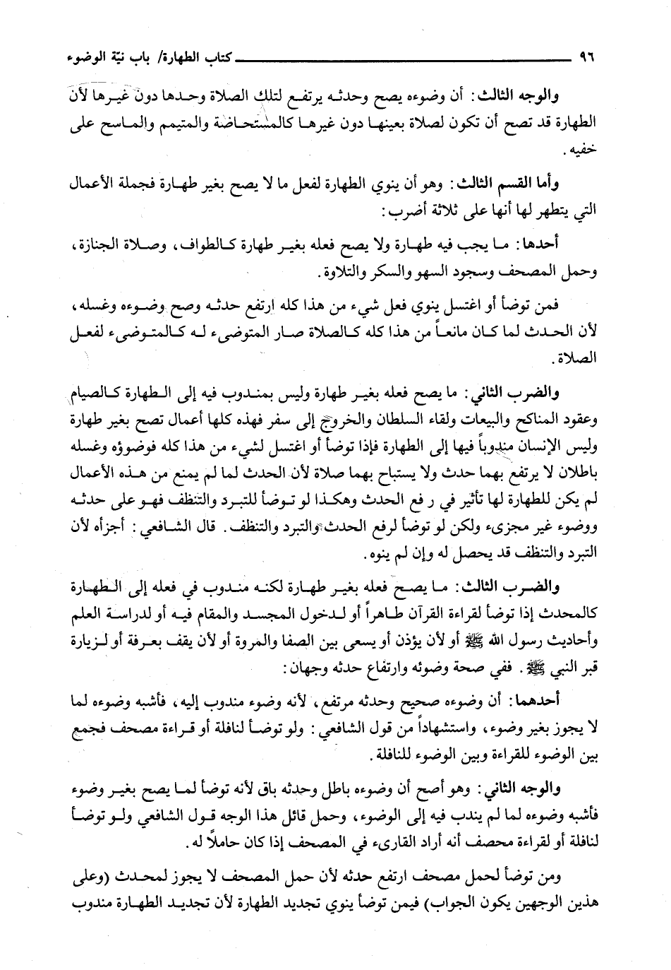 والضرب الثالث: ما يصح فعله طَهَارَةٍ لَكِنَّهُ مَنْدُوبٌ فِي فِعْلِهِ إِلَى الطَّهَارَةِ كَالْمُحْدِثِ إِذَا تَوَضَّأَ لِقِرَاءَةِ الْقُرْآنِ طَاهِرًا أَوْ لِدُخُولِ الْمَسْجِدِ وَالْمُقَامِ فِيهِ أَوْ لِدِرَاسَةِ الْعِلْمِ وَأَحَادِيثِ رَسُولِ اللَّهِ - صَلَّى اللَّهُ عَلَيْهِ وَسَلَّم َ - أَوْ لِأَنْ يُؤَذِّنَ أَوْ يَسْعَى بَيْنَ الصَّفَا وَالْمَرْوَةِ أَوْ لِأَنْ يَقِفَ بِعَرَفَةَ أَوْ لِزِيَارَةِ قبر النبي - صَلَّى اللَّهُ عَلَيْهِ وَسَلَّم َ -. فَفِي صِحَّةِ وُضُوئِهِ وَارْتِفَاعِ حَدَثِهِ وَجْهَانِ: