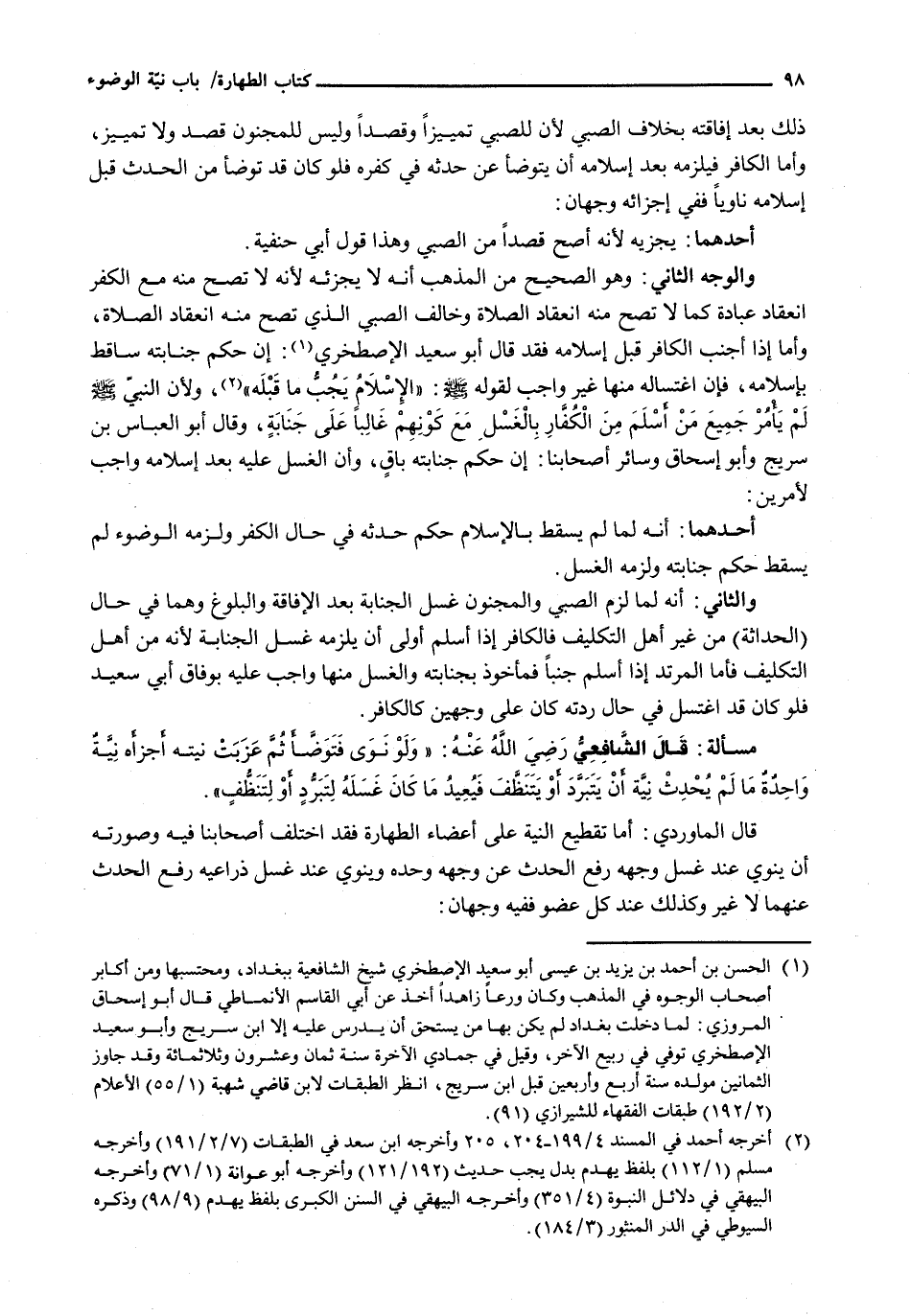 وَالْوَجْهُ الثَّانِي: وَهُوَ الصَّحِيحُ مِنَ الْمَذْهَبِ أَنَّهُ لَا يُجْزِئُهُ لِأَنَّهُ لَا تَصِحُّ مِنْهُ مَعَ الْكُفْرِ انْعِقَادُ عِبَادَةٍ كَمَا لَا تَصِحُّ مِنْهُ انْعِقَادُ الصَّلَاةِ وَخَالَفَ الصَّبِيَّ الَّذِي تَصِحُّ مِنْهُ انْعِقَادُ الصلاة، وأما إِذَا أَجْنَبَ الْكَافِرُ قَبْلَ إِسْلَامِهِ فَقَدْ قَالَ أَبُو سَعِيدٍ الْإِصْطَخْرِيُّ: إِنَّ حُكْمَ جَنَابَتِهِ سَاقِطٌ بِإِسْلَامِهِ، فَإِنَّ اغْتِسَالَهُ مِنْهَا غَيْرُ وَاجِبٍ لِقَوْلِهِ - صَلَّى اللَّهُ عَلَيْهِ وَسَلَّم َ -: " الْإِسْلَامُ يَجُبُّ مَا قَبْلَهُ "، وَلِأَنَّ النَّبِيَّ - صَلَّى اللَّهُ عَلَيْهِ وَسَلَّم َ - لَمْ يَأْمُرْ جَمِيعَ مَنْ أَسْلَمَ مِنَ الْكُفَّارِ بِالْغُسْلِ مَعَ كَوْنِهِمْ غَالِبًا عَلَى جَنَابَةٍ، وَقَالَ أَبُو الْعَبَّاسِ بْنُ سُرَيْجٍ وَأَبُو إِسْحَاقَ وَسَائِرُ أَصْحَابِنَا: إِنَّ حُكْمَ جَنَابَتِهِ بَاقٍ، وَإِنَّ الْغُسْلَ عَلَيْهِ بَعْدَ إِسْلَامِهِ وَاجِبٌ لِأَمْرَيْنِ: