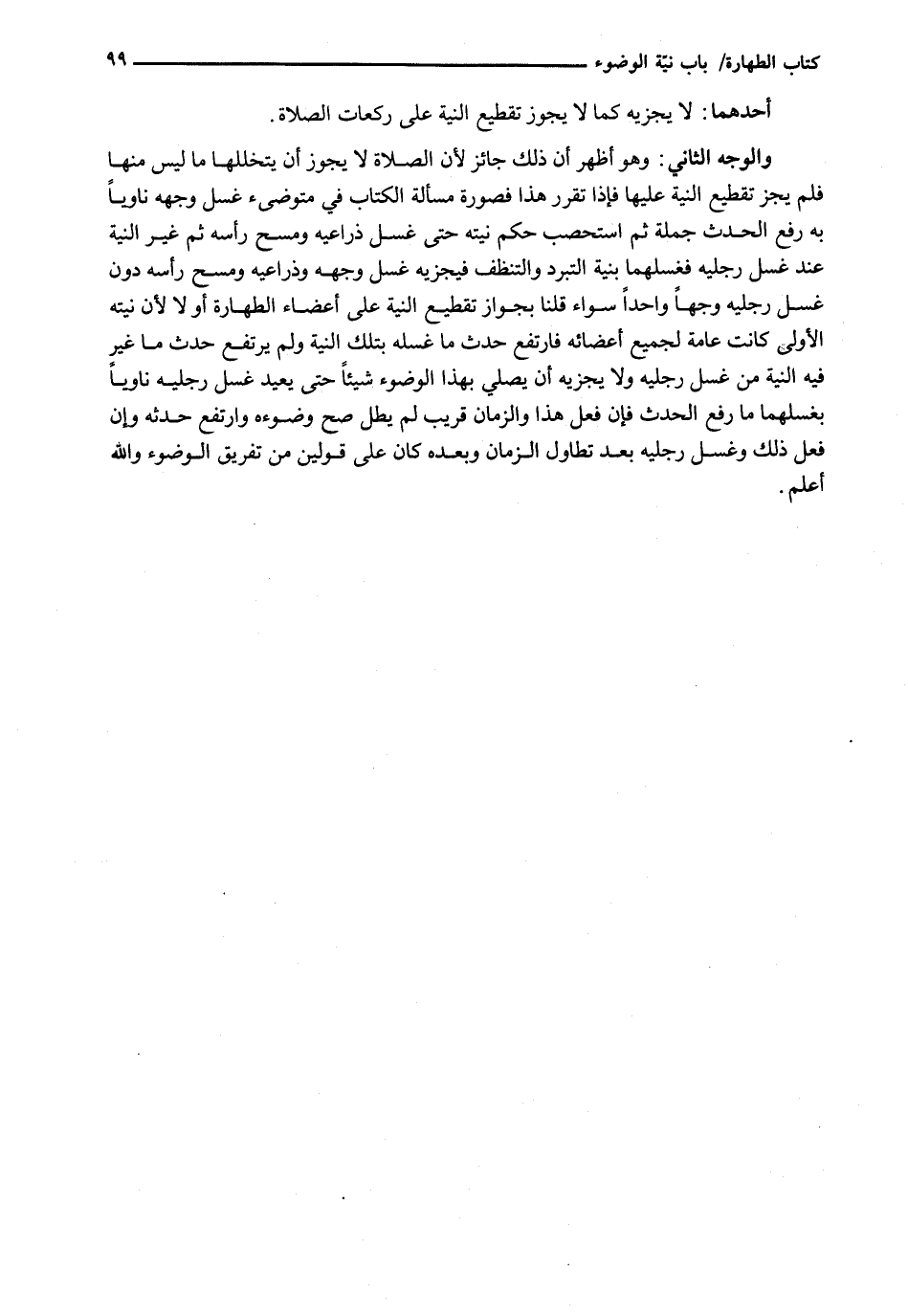 وَالْوَجْهُ الثَّانِي: وَهُوَ أَظْهَرُ أَنَّ ذَلِكَ جَائِزٌ لِأَنَّ الصَّلَاةَ لَا يَجُوزُ أَنْ يَتَخَلَّلَهَا مَا لَيْسَ مِنْهَا فَلَمْ يَجُزْ تَقْطِيعُ النِّيَّةِ عَلَيْهَا فَإِذَا تَقَرَّرَ هَذَا فَصُورَةُ مَسْأَلَةِ الْكِتَابِ فِي مُتَوَضِّئٍ غَسَلَ وَجْهَهُ نَاوِيًا بِهِ رَفْعَ الحدث جملة ثم استحصب حُكْمَ نِيَّتِهِ حَتَّى غَسَلَ ذِرَاعَيْهِ وَمَسَحَ رَأْسَهُ ثُمَّ غَيَّرَ النِّيَّةَ عِنْدَ غَسْلِ رِجْلَيْهِ فَغَسَلَهُمَا بِنِيَّةِ التَّبَرُّدِ وَالتَّنَظُّفِ فَيُجْزِيهِ غَسْلُ وَجْهِهِ وَذِرَاعَيْهِ وَمَسْحُ رَأْسِهِ دُونَ غَسْلِ رِجْلَيْهِ وَجْهًا وَاحِدًا سَوَاءٌ قُلْنَا بِجَوَازِ تَقْطِيعِ النِّيَّةِ عَلَى أَعْضَاءِ الطهارة أولا لِأَنَّ نِيَّتَهُ الْأُولَى كَانَتْ عَامَّةً لِجَمِيعِ أَعْضَائِهِ فَارْتَفَعَ حَدَثُ مَا غَسَلَهُ بِتِلْكَ النِّيَّةِ وَلَمْ يَرْتَفِعْ حَدَثُ مَا غَيَّرَ فِيهِ النِّيَّةَ مِنْ غَسْلِ رِجْلَيْهِ وَلَا يُجْزِيهِ أَنْ يُصَلِّيَ بِهَذَا الْوُضُوءِ شَيْئًا حَتَّى يُعِيدَ غَسْلَ رِجْلَيْهِ نَاوِيًا بغسلهما ما رَفْعَ الْحَدَثِ فَإِنْ فَعَلَ هَذَا وَالزَّمَانُ قَرِيبٌ لم يطل صح وضوءه وَارْتَفَعَ حَدَثُهُ وَإِنْ فَعَلَ ذَلِكَ وَغَسَلَ رِجْلَيْهِ بَعْدَ تَطَاوُلِ الزَّمَانِ وَبُعْدِهِ كَانَ عَلَى قَوْلَيْنِ مِنْ تَفْرِيقِ الْوُضُوءِ وَاللَّهُ أَعْلَمُ.