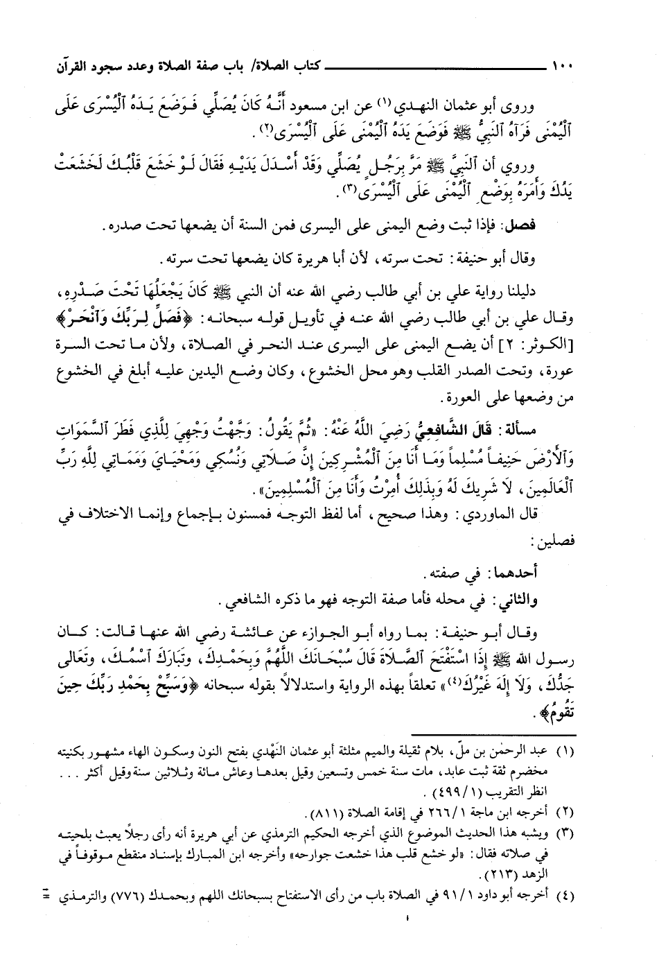 وَرَوَى أَبُو عُثْمَانَ النَّهْدِيُّ عَنِ ابْنِ مَسْعُودٍ أَنَّهُ كَانَ يُصَلِّي فَوَضَعَ يَدَهُ الْيُسْرَى عَلَى الْيُمْنَى فَرَآهُ النَّبِيُّ - صَلَّى اللَّهُ عَلَيْهِ وَسَلَّم َ - فَوَضَعَ يَدَهُ الْيُمْنَى عَلَى الْيُسْرَى
