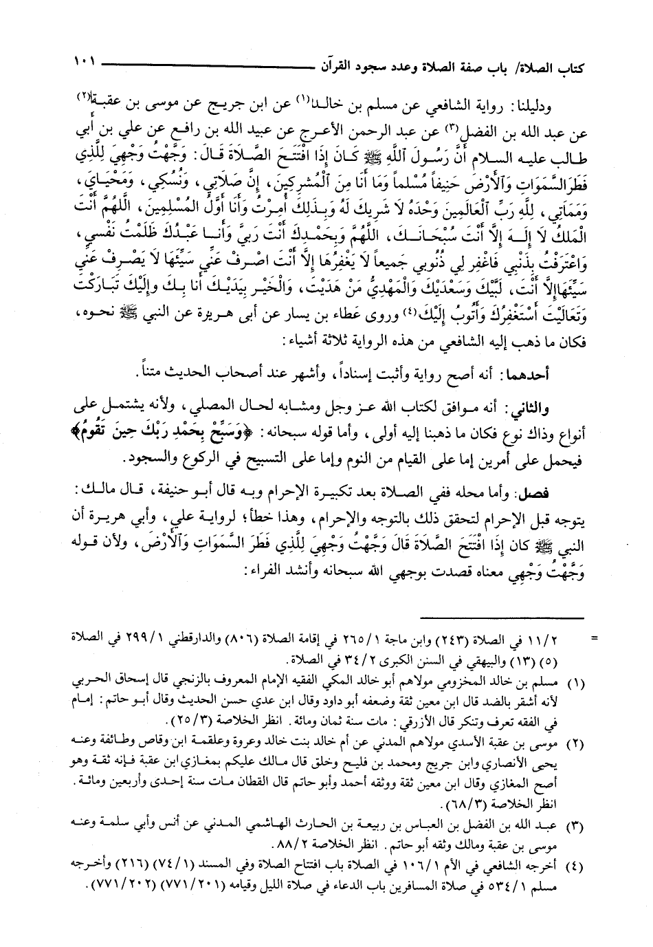 وَدَلِيلُنَا: رِوَايَةُ الشَّافِعِيِّ عَنْ مُسْلِمِ بْنِ خَالِدٍ عَنِ ابْنِ جُرَيْجٍ عَنْ مُوسَى بْنِ عُقْبَةَ عَنْ عَبْدِ اللَّهِ بْنِ الْفَضْلِ عَنْ عَبْدِ الرَّحْمَنِ الْأَعْرَجِ عَنْ عُبَيْدِ اللَّهِ بْنِ رَافِعٍ عَنْ عَلِيِّ بْنِ أَبِي طَالِبٍ عَلَيْهِ السَّلَامُ إِنِ رَسُولَ اللَّهِ - صَلَّى اللَّهُ عَلَيْهِ وَسَلَّم َ - كَانَ إِذَا افْتَتَحَ الصَّلَاةَ قَالَ: وَجَّهْتُ وَجْهِيَ للذي فطر السموات وَالْأَرْضَ حَنِيفًا مُسْلِمًا وَمَا أَنَا مِنَ الْمُشْرِكِينَ، إِنَّ صَلَاتِي، وَنُسُكِي، وَمَحْيَايَ، وَمَمَاتِي، لِلَّهِ رَبِّ الْعَالَمِينَ وَحْدَهُ لَا شَرِيكَ لَهُ وَبِذَلِكَ أُمِرْتُ وأنا أول الْمُسْلِمِينَ، اللَّهُمَّ أَنْتَ الْمَلِكُ لَا إِلَهَ إِلَّا أَنْتَ سُبْحَانَكَ، اللَّهُمَّ وَبِحَمْدِكَ أَنْتَ رَبِّي وَأَنَا عَبْدُكَ ظَلَمْتُ نَفْسِي، وَاعْتَرَفْتُ بِذَنْبِي فَاغْفِرْ لِي ذُنُوبِي جَمِيعًا لَا يَغْفِرُهَا إِلَّا أَنْتَ اصْرِفْ عَنِّي سَيِّئَهَا لَا يَصْرِفُ عَنِّي سَيِّئَهَا إِلَّا أَنْتَ، لَبَّيْكَ وَسَعْدَيْكَ وَالْمَهْدِيُّ مَنْ هَدَيْتَ، وَالْخَيْرُ بِيَدَيْكَ أَنَا بِكَ وَإِلَيْكَ تَبَارَكْتَ وَتَعَالَيْتَ أَسْتَغْفِرُكَ وَأَتُوبُ إِلَيْكَ وَرَوَى عَطَاءُ بْنُ يَسَارٍ عَنْ أَبِي هُرَيْرَةَ عَنِ النَّبِيِّ - صَلَّى اللَّهُ عَلَيْهِ وَسَلَّم َ - نَحْوَهُ، فَكَانَ مَا ذَهَبَ إِلَيْهِ الشَّافِعِيُّ مِنْ هذه الرواية ثلاثة أشياء: