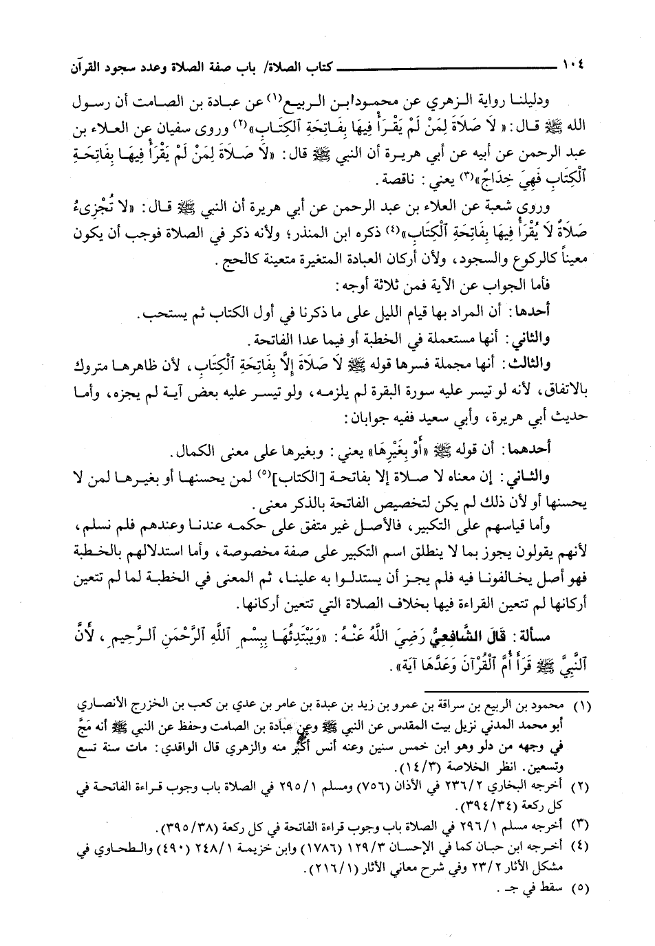 وَدَلِيلُنَا رِوَايَةُ الزُّهْرِيُّ عَنْ مَحْمُودِ بْنِ الرَّبِيعِ عَنْ عُبَادَةَ بْنِ الصَّامِتِ أَنَّ رَسُولَ اللَّهِ - صَلَّى اللَّهُ عَلَيْهِ وَسَلَّم َ - قَالَ: " لَا صَلَاةَ لِمَنْ لَمْ يَقْرَأْ فِيهَا بِفَاتِحَةِ الْكِتَابِ " وَرَوَى سُفْيَانُ عَنِ الْعَلَاءِ بْنِ عَبْدِ الرَّحْمَنِ عَنْ أَبِيهِ عَنْ أَبِي هُرَيْرَةَ أَنَّ النَّبِيَّ - صَلَّى اللَّهُ عَلَيْهِ وَسَلَّم َ - قَالَ " لَا صَلَاةَ لِمَنْ لَمْ يَقْرَأْ فِيهَا بِفَاتِحَةِ الْكِتَابِ فَهِيَ خِدَاجٌ " يَعْنِي: نَاقِصَةٌ