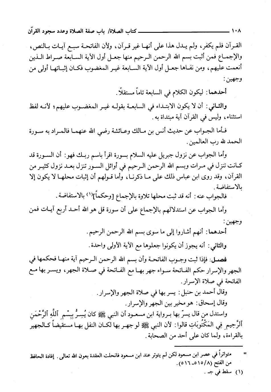 الْقُرْآنِ فَلَمْ يُكَفَّرْ، وَلَمْ يَدُلَّ هَذَا عَلَى أَنَّهَا غَيْرُ قُرْآنٍ، وَلِأَنَّ الْفَاتِحَةَ سَبْعُ آيَاتٍ بِالنَّصِّ، وَالْإِجْمَاعِ فَمَنْ أَثْبَتَ بِسْمِ اللَّهِ الرَّحْمَنِ الرَّحِيمِ مِنْهَا جَعَلَ أَوَّلَ الْآيَةِ السَّابِعَةِ صِرَاطَ الذين أنعمت عليهم، وَمَنْ نَفَاهَا جَعَلَ أَوَّلَ الْآيَةِ السَّابِعَةِ غَيْرِ المغضوب فَكَانَ إِثْبَاتُهَا أَوْلَى مِنْ وَجْهَيْنِ: