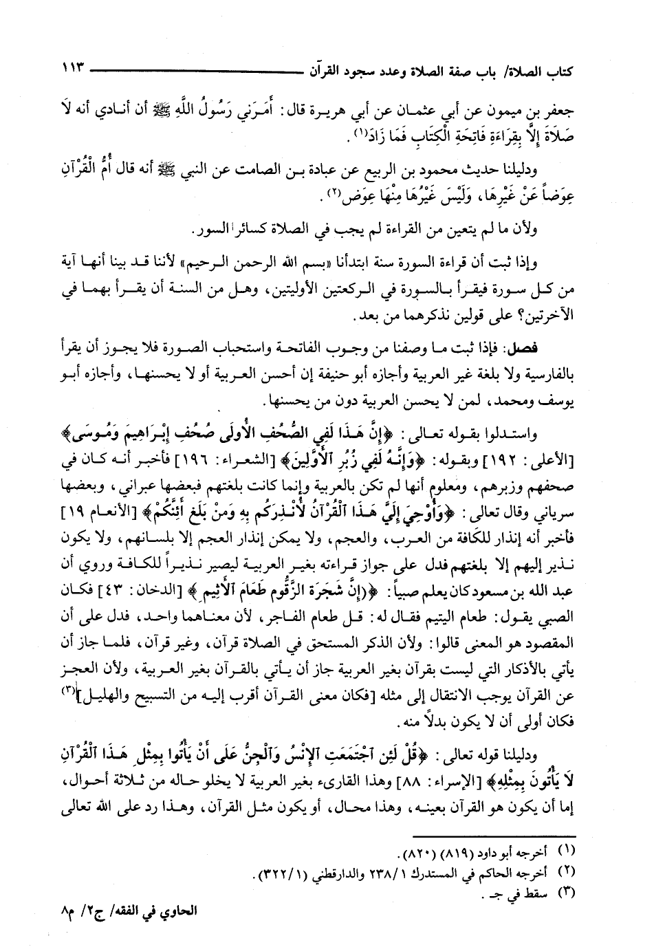 وَاسْتَدَلُّوا بِقَوْلِهِ تَعَالَى: {إِنَّ هَذَا لفي الصحف الأولى صُحُفِ إِبْرَاهِيمَ وَمُوسَى} [الأعلى: 192] وَبِقَوْلِهِ: {وَإِنَّهُ لَفِي زُبُرِ الأَوَّلِينَ} [الشعراء: 196] فَأَخْبَرَ أَنَّهُ كَانَ فِي صُحُفِهِمْ وَزُبُرِهِمْ، وَمَعْلُومٌ أَنَّهَا لَمْ تَكُنْ بِالْعَرَبِيَّةِ وَإِنَّمَا كَانَتْ بِلُغَتِهِمْ فَبَعْضُهَا عِبْرَانِيٌّ، وَبَعْضُهَا سُرْيَانِيٌّ وقال تعالى: {وأوحي إلي هذا القرآن لا نذركم بِهِ وَمَنْ بَلَغَ أَئِنَّكُمْ} [الأنعام 19] فَأَخْبَرَ أَنَّهُ إِنْذَارٌ لِلْكَافَّةِ مِنَ الْعَرَبِ، وَالْعَجَمِ، وَلَا يُمْكِنُ إنذار العجم بِلِسَانِهِمْ، وَلَا يَكُونُ نَذِيرٌ إِلَيْهِمْ إِلَّا بِلُغَتِهِمْ فَدَلَّ عَلَى جَوَازِ قِرَاءَتِهِ بِغَيْرِ الْعَرَبِيَّةِ لِيَصِيرَ نَذِيرًا لِلْكَافَّةِ وَرُوِيَ أَنَّ عَبْدَ اللَّهِ بْنَ مسعود كان يعلم صبياً: {إن شجرة الزقوم طَعَامُ الأَثِيمِ} [الدخان: 43] فَكَانَ الصَّبِيُّ يَقُولُ: طَعَامُ الْيَتِيمِ فَقَالَ لَهُ: قُلْ طَعَامُ الْفَاجِرِ، لِأَنَّ مَعْنَاهُمَا وَاحِدٌ، فَدَلَّ عَلَى أَنَّ الْمَقْصُودَ هُوَ الْمَعْنَى قَالُوا: وَلِأَنَّ الذِّكْرَ الْمُسْتَحَقَّ فِي الصَّلَاةِ قُرْآنٌ، وَغَيْرُ قُرْآنٍ، فَلَمَّا جَازَ أَنْ يَأْتِيَ بِالْأَذْكَارِ الَّتِي لَيْسَتْ بِقُرْآنٍ بِغَيْرِ الْعَرَبِيَّةِ جَازَ أَنْ يَأْتِيَ بِالْقُرْآنِ بِغَيْرِ الْعَرَبِيَّةِ، وَلِأَنَّ الْعَجْزَ عَنِ الْقُرْآنِ يُوجِبُ الِانْتِقَالَ إِلَى مِثْلِهِ [فَكَانَ معنى القرآن أقرب إليه من التسبيح والهليل] فَكَانَ أَوْلَى أَنْ لَا يَكُونَ بَدَلًا مِنْهُ