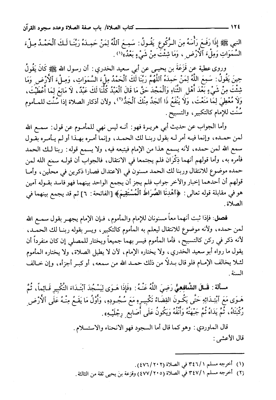 : فَإِذَا ثَبَتَ أَنَّهُمَا مَعًا مَسْنُونَانِ لِلْإِمَامِ وَالْمَأْمُومِ، فَإِنَّ الْإِمَامَ يَجْهَرُ بِقَوْلِ سَمِعِ اللَّهُ لِمَنْ حَمِدَهُ، وَلِأَنَّهُ مَوْضُوعٌ لِلِانْتِقَالِ لِيَعْلَمَ بِهِ الْمَأْمُومُ كَالتَّكْبِيرِ، وَيُسِرُّ بِقَوْلِهِ رَبَّنَا لَكَ الْحَمْدُ، لِأَنَّهُ ذِكْرٌ فِي رُكْنٍ كَالتَّسْبِيحِ، فَأَمَّا الْمَأْمُومُ فَيُسِرُّ بِهِمَا جَمِيعًا وَيَخْتَارُ لِلْمُصَلِّي إِنْ كَانَ مُنْفَرِدًا أَنْ يَقُولَ مَا رَوَاهُ أَبُو سَعِيدٍ الْخُدْرِيُّ، وَلَا يَخْتَارُهُ الْإِمَامُ، لِأَنْ لَا يُطِيلُ الصَّلَاةَ، وَلَا يَخْتَارُهُ الْمَأْمُومُ لِئَلَّا يُخَالِفَ الْإِمَامَ فَلَوْ قَالَ بَدَلًا مِنْ ذَلِكَ حَمِدَ اللَّهُ مَنْ سَمِعَهُ، أَوْ كَبَّرَ أَجْزَأَهُ، وَإِنْ خَالَفَ السنة
