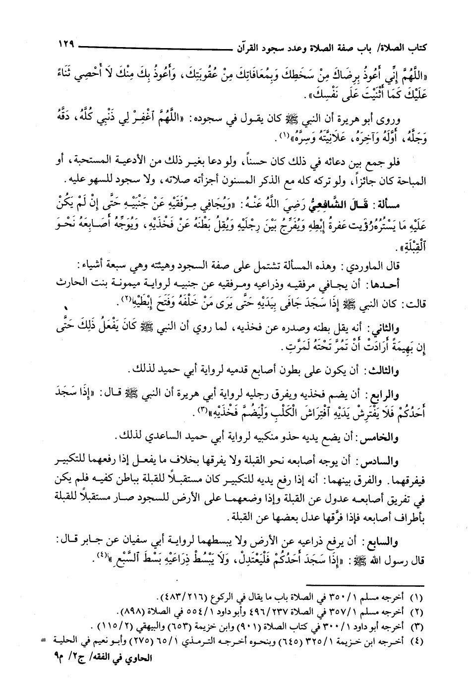 قَالَ الْمَاوَرْدِيُّ: وَهَذِهِ الْمَسْأَلَةُ تَشْتَمِلُ عَلَى صِفَةِ السُّجُودِ وَهَيْئَتِهِ وَهِيَ سَبَعَةُ أَشْيَاءَ: