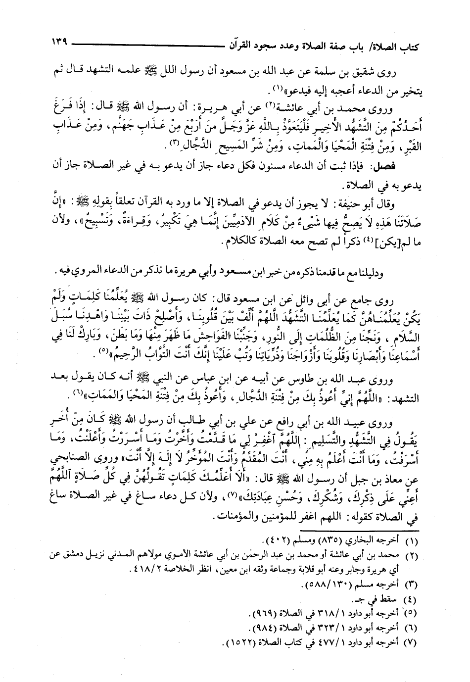 وَرَوَى عَبْدُ اللَّهِ بْنُ طَاوُسٍ عَنْ أَبِيهِ عَنِ ابْنِ عَبَّاسٍ عَنِ النَّبِيِّ - صَلَّى اللَّهُ عَلَيْهِ وَسَلَّم َ - أنه كان يَقُولُ بَعْدَ التَّشَهُّدِ " اللَّهُمَّ إِنِّي أَعُوذُ بِكَ مِنْ فِتْنَةِ الدَّجَّالِ، وَأَعُوذُ بِكَ مِنْ فِتْنَةِ المحيا والممات ". كان من اخر يقول في التشهد والتسلم: اللَّهُمَّ اغْفِرْ لِي مَا قَدَّمْتُ وَأَخَّرْتُ وَمَا أَسْرَرْتُ وَأَعْلَنْتُ، وَمَا أَسْرَفْتُ، وَمَا أَنْتَ أَعْلَمُ بِهِ مِنِّي، أَنْتَ الْمُقَدِّمُ وَأَنْتَ الْمُؤَخِّرُ لَا إِلَهَ إِلَّا أَنْتَ " وَرَوَى الصُّنَابِحِيُّ عَنْ مُعَاذِ بْنِ جَبَلٍ أَنَّ رَسُولَ اللَّهِ - صَلَّى اللَّهُ عَلَيْهِ وَسَلَّم َ - قال: " لا أُعَلِّمُكَ كَلِمَاتٍ تَقُولُهُنَّ فِي كُلِّ صَلَاةٍ اللَّهُمَّ أَعِنِّي عَلَى ذِكْرِكَ، وَشُكْرِكَ، وَحُسْنِ عِبَادَتِكَ "، وَلِأَنَّ كُلَّ دُعَاءٍ سَاغَ فِي غَيْرِ الصَّلَاةِ سَاغَ فِي الصَّلَاةِ كَقَوْلِهِ: اللَّهُمَّ اغْفِرْ لِلْمُؤْمِنِينَ وَالْمُؤْمِنَاتِ