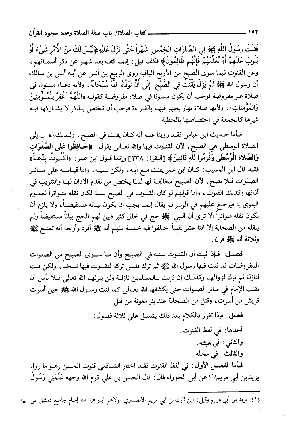 فَأَمَّا حَدِيثُ ابْنِ عَبَّاسٍ فَقَدْ رُوِّينَا عَنْهُ أَنَّهُ كَانَ يَقْنُتُ فِي الصُّبْحِ، وَلِذَلِكَ ذَهَبَ إِلَى الصَّلَاةِ الْوُسْطَى هِيَ الصُّبْحُ، لِأَنَّ الْقُنُوتَ فِيهَا وَاللَّهُ تَعَالَى يَقُولُ: {حَافِظُوا عَلَى الصَّلَوَاتِ وَالصَّلاةِ الْوُسْطَى وَقُومُوا لِلَّهِ قَانِتِينَ} [البقرة: 238] وَإِنَّمَا قَوْلُ ابْنِ عُمَرَ: " الْقُنُوتُ بِدْعَةٌ " فَقَدْ قَالَ ابْنُ الْمُسَيَّبِ: كَانَ ابْنُ عُمَرَ يَقْنُتُ مَعَ أَبِيهِ، وَلَكِنْ نَسِيَهُ، وَأَمَّا قِيَاسُهُ عَلَى سَائِرِ الصَّلَوَاتِ فَلَا يَصِحُّ، لِأَنَّ الصُّبْحَ مُخَالِفَةٌ لَهَا لِمَا يَخْتَصُّ مِنْ تَقَدُّمِ الْأَذَانِ لَهَا وَالتَّثْوِيبِ فِي أَذَانِهَا وَكَذَلِكَ الْقُنُوتُ، وَأَمَّا قَوْلُهُمْ لَوْ كَانَ الْقُنُوتُ فِي الصُّبْحِ سُنَّةً لَكَانَ نَقْلُهُ مُتَوَاتِرًا لِعُمُومِ الْبَلْوَى بِهِ فَيَرْجِعُ عَلَيْهِمْ فِي الْوِتْرِ ثُمَّ يُقَالُ إِنَّمَا يَجِبُ أَنْ يَكُونَ بَيَانُهُ مُسْتَفِيضًا، وَلَا يَلْزَمُ أَنْ يَكُونَ نَقْلُهُ مُتَوَاتِرًا أَلَا تَرَى أَنَّ النَّبِيَّ - صَلَّى اللَّهُ عَلَيْهِ وَسَلَّم َ - حَجَّ فِي خَلْقٍ كَثِيرٍ فَبَيَّنَ لَهُمُ الْحَجَّ بَيَانًا مُسْتَفِيضًا وَلَمْ يَنْقُلْهُ مِنَ الصَّحَابَةِ إِلَّا اثْنَا عَشَرَ نَفْسًا اخْتَلَفُوا فِيهِ خَمْسَةٌ مِنْهُمْ أنه - صَلَّى اللَّهُ عَلَيْهِ وَسَلَّم َ - أَفْرَدَ وَأَرْبَعَةٌ أَنَّهُ تَمَتَّعَ - صَلَّى اللَّهُ عَلَيْهِ وَسَلَّم َ - وثلاثة أنه - صَلَّى اللَّهُ عَلَيْهِ وَسَلَّم َ - قَرَنَ