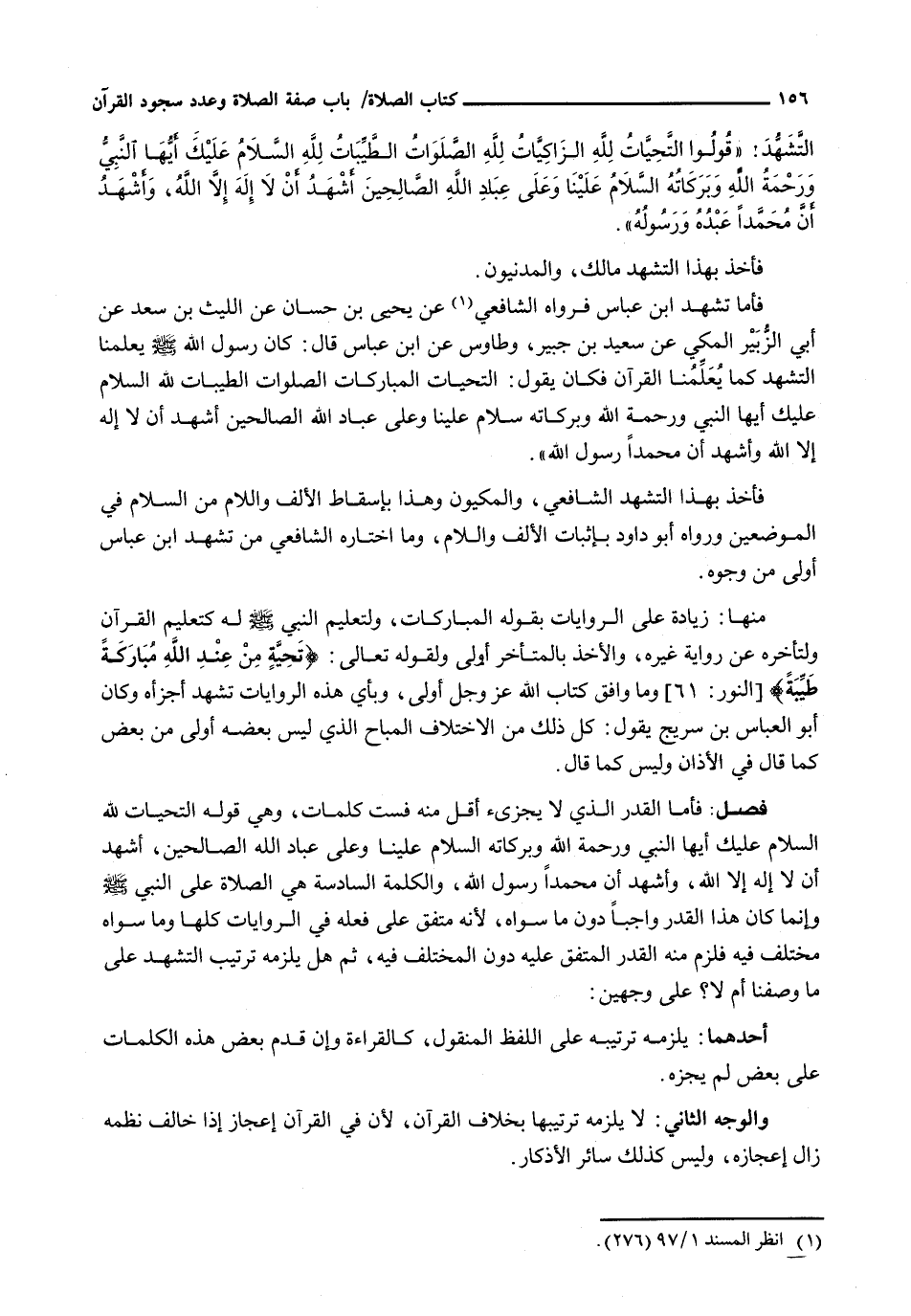 فَأَخَذَ بِهَذَا التَّشَهُّدِ الشَّافِعِيُّ، وَالْمَكِّيُّونَ وَهَذَا بِإِسْقَاطِ الْأَلِفِ وَاللَّامِ مِنَ السَّلَامِ فِي الْمَوْضِعَيْنِ وَرَوَاهُ أَبُو دَاوُدَ بِإِثْبَاتِ الْأَلِفِ وَاللَّامِ، وَمَا اخْتَارَهُ الشَّافِعِيُّ مِنْ تَشَهُّدِ ابْنِ عَبَّاسٍ أَوْلَى مِنْ وُجُوهٍ