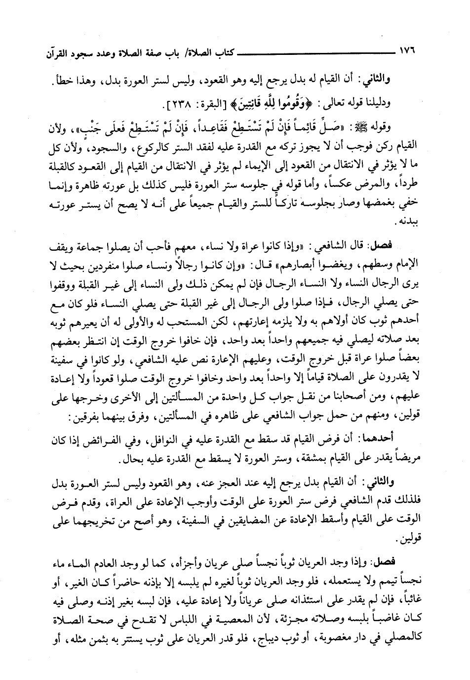 وَالثَّانِي: أَنَّ الْقِيَامَ لَهُ بَدَلٌ يَرْجِعُ إِلَيْهِ وَهُوَ الْقُعُودُ، وَلَيْسَ لِسَتْرِ الْعَوْرَةِ بَدَلٌ، وَهَذَا خَطَأٌ. وَدَلِيلُنَا قَوْله تَعَالَى: {وَقُومُوا لِلَّهِ قَانِتِينَ} [البقرة: 238]