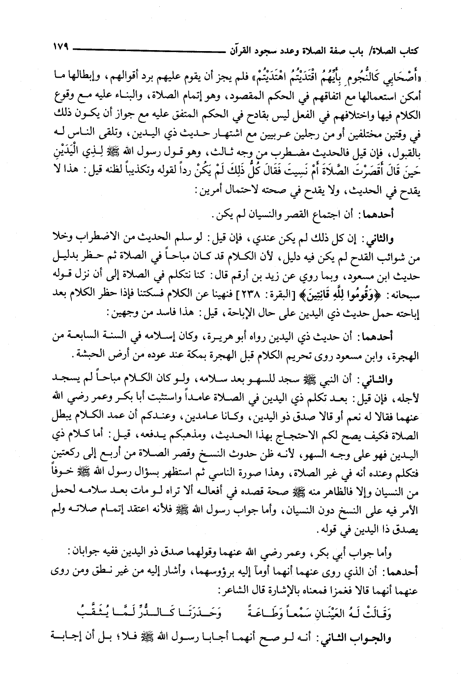 وَالثَّانِي: أَنَّ النَّبِيَّ - صَلَّى اللَّهُ عَلَيْهِ وَسَلَّم َ - سَجَدَ لِلسَّهْوِ بَعْدَ سَلَامِهِ، وَلَوْ كَانَ الْكَلَامُ مُبَاحًا لَمْ يَسْجُدْ لِأَجْلِهِ، فَإِنْ قِيلَ: بَعْدَ تَكَلُّمِ ذِي الْيَدَيْنِ فِي الصَّلَاةِ عَامِدًا وَاسْتَثْبَتَ أَبَا بَكْرٍ وَعُمَرَ رَضِيَ اللَّهُ عَنْهُمَا فَقَالَا لَهُ نَعَمْ أَوْ قَالَا صَدَقَ ذُو الْيَدَيْنِ، وَكَانَا عَامِدَيْنِ، وَعِنْدَكُمْ أَنَّ عَمْدَ الْكَلَامِ يُبْطِلُ الصَّلَاةَ فَكَيْفَ يَصِحُّ لَكُمُ الِاحْتِجَاجُ بِهَذَا الْحَدِيثِ، وَمَذْهَبُكُمْ يَدْفَعُهُ، قِيلَ: أَمَّا كَلَامُ ذِي الْيَدَيْنِ فَهُوَ عَلَى وَجْهِ السَّهْوِ، لِأَنَّهُ ظَنَّ حُدُوثَ النَّسْخِ وَقَصْرِ الصَّلَاةِ مِنْ أَرْبَعٍ إِلَى رَكْعَتَيْنِ فَتَكَلَّمَ وَعِنْدَهُ أَنَّهُ فِي غَيْرِ الصَّلَاةِ، وَهَذَا صُورَةُ النَّاسِي ثُمَّ اسْتَظْهَرَ بِسُؤَالِ رَسُولِ اللَّهِ - صَلَّى اللَّهُ عَلَيْهِ وَسَلَّم َ - خَوْفًا مِنَ النِّسْيَانِ وَإِلَّا فَالظَّاهِرُ مِنْهُ - صَلَّى اللَّهُ عَلَيْهِ وَسَلَّم َ - صِحَّةُ قَصْدِهِ فِي أَفْعَالِهِ أَلَا تَرَاهُ لَوْ مَاتَ بَعْدَ سَلَامِهِ لَحُمِلَ الْأَمْرُ فِيهِ عَلَى النَّسْخِ دُونَ النِّسْيَانِ، وَأَمَّا جَوَابُ رَسُولِ اللَّهِ - صَلَّى اللَّهُ عَلَيْهِ وَسَلَّم َ - فَلِأَنَّهُ اعْتَقَدَ إِتْمَامَ صَلَاتِهِ وَلَمْ يُصَدِّقْ ذَا الْيَدَيْنِ فِي قَوْلِهِ