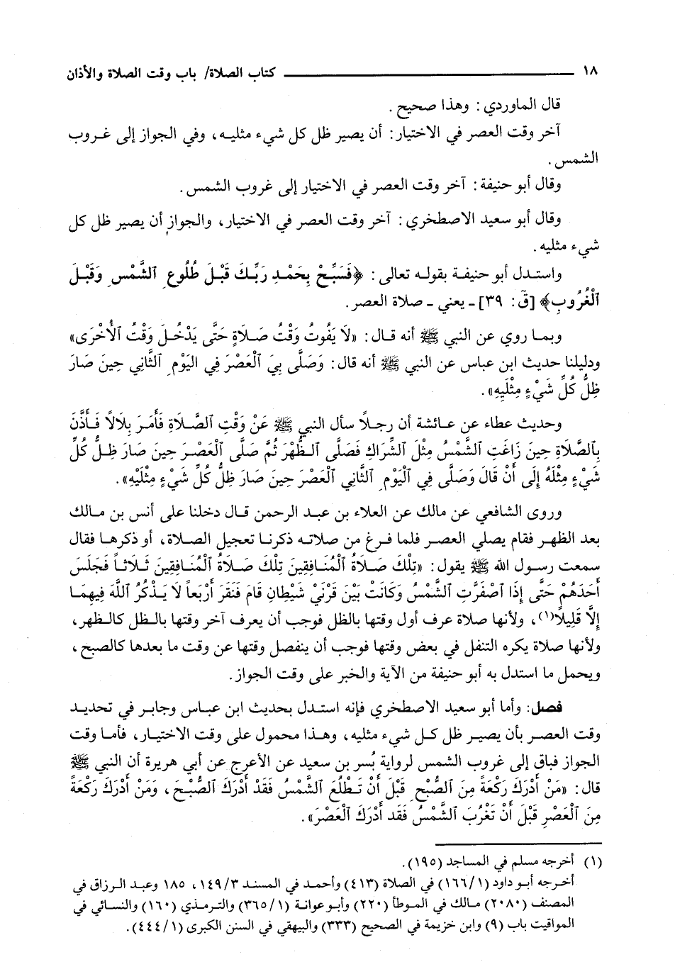 وَرَوَى الشَّافِعِيُّ عَنْ مَالِكٍ عَنِ الْعَلَاءِ بْنِ عَبْدِ الرَّحْمَنِ قَالَ دَخَلْنَا عَلَى أَنَسِ بْنِ مَالِكٍ بَعْدَ الظُّهْرِ فَقَامَ يُصَلِّي الْعَصْرَ فَلَمَّا فَرَغَ مِنْ صِلَاتِهِ ذَكَرْنَا تَعْجِيلَ الصَّلَاةِ، أَوْ ذِكْرَهَا فَقَالَ سَمِعْتُ رَسُولَ اللَّهِ - صَلَّى اللَّهُ عَلَيْهِ وَسَلَّم َ - يَقُولُ: " تِلْكَ صَلَاةُ الْمُنَافِقِينَ تِلْكَ صَلَاةُ الْمُنَافِقِينَ ثَلَاثًا فَجَلَسَ أَحَدُهُمْ حَتَّى إِذَا اصْفَرَّتِ الشَّمْسُ وَكَانَتْ بَيْنَ قَرْنَيْ شَيْطِانٍ قَامَ فَنَقَرَ أَرْبَعًا لَا يَذْكُرُ اللَّهَ فِيهِمَا إِلَّا قَلِيلًا، وَلِأَنَّهَا صَلَاةٌ عَرَفَ أَوَّلَ وَقْتِهَا بِالظِّلِّ فَوَجَبَ أَنْ يَعْرِفَ آخِرَ وَقْتِهَا بِالظِّلِّ كَالظُّهْرِ، وَلِأَنَّهَا صَلَاةٌ يُكْرَهُ التَّنَفُّلُ فِي بَعْضِ وَقْتِهَا فَوَجَبَ أَنْ يَنْفَصِلَ وَقْتُهَا عَنْ وَقْتِ مَا بَعْدَهَا كَالصُّبْحِ، وَيُحْمَلُ مَا اسْتَدَلَّ بِهِ أبو حنيفة مِنَ الْآيَةِ وَالْخَبَرِ عَلَى وَقْتِ الْجَوَازِ.