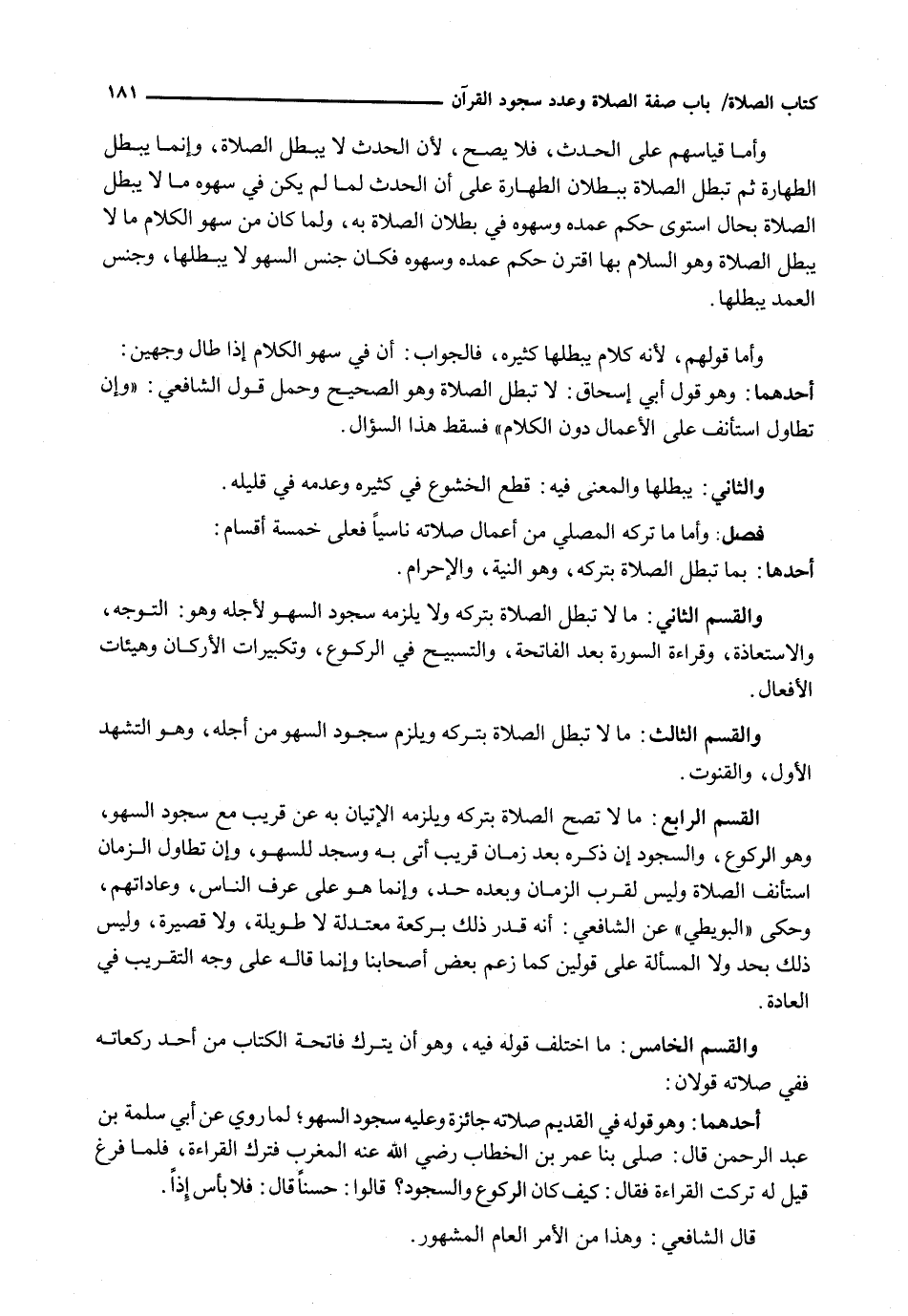 : وَأَمَّا مَا تَرَكَهُ الْمُصَلِّي مِنْ أَعْمَالِ صَلَاتِهِ نَاسِيًا فَعَلَى خَمْسَةِ أَقْسَامٍ: