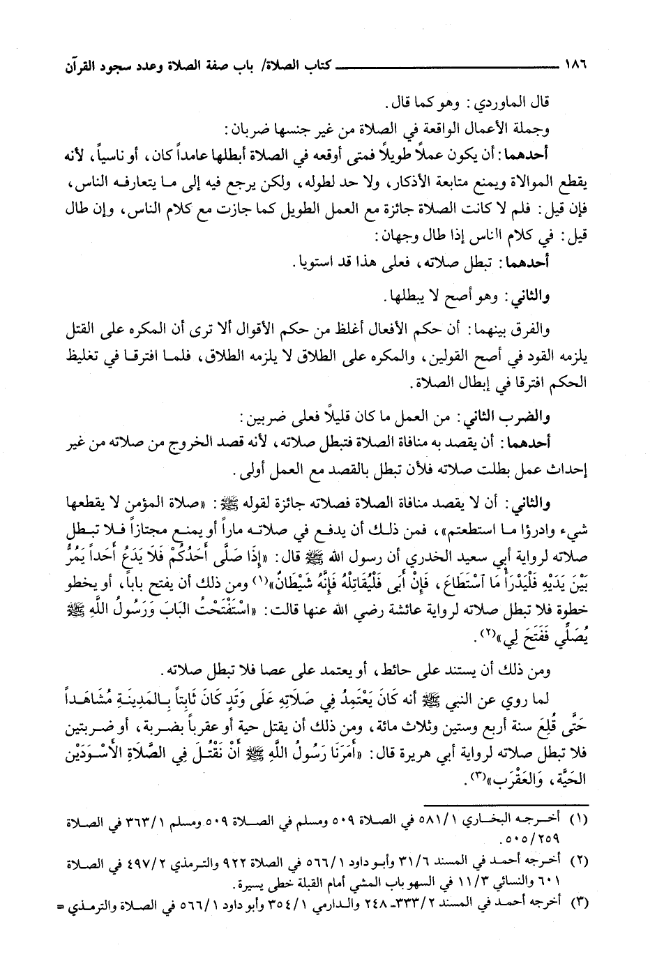 لَمَّا رُوِيَ عَنِ النَّبِيِّ - صَلَّى اللَّهُ عَلَيْهِ وَسَلَّم َ - أَنَّهُ كَانَ يَعْتَمِدُ فِي صَلَاتِهِ عَلَى وتدٍ كَانَ ثَابِتًا بِالْمَدِينَةِ مُشَاهَدًا حَتَّى قُلِعَ سَنَةَ أَرْبَعٍ وَسِتِّينَ وَثَلَاثِ مِائَةٍ، وَمِنْ ذَلِكَ أَنْ يَقْتُلَ حَيَّةً أَوْ عَقْرَبًا بِضَرْبَةٍ، أَوْ ضَرْبَتَيْنِ فَلَا تَبْطُلُ صَلَاتُهُ لِرِوَايَةِ أَبِي هُرَيْرَةَ قَالَ: " أَمَرَنَا رَسُولُ اللَّهِ - صَلَّى اللَّهُ عَلَيْهِ وَسَلَّم َ - أَنْ نَقْتُلَ فِي الصَّلَاةِ الْأَسْوَدَيْنِ الْحَيَّةَ، وَالْعَقْرَبَ "