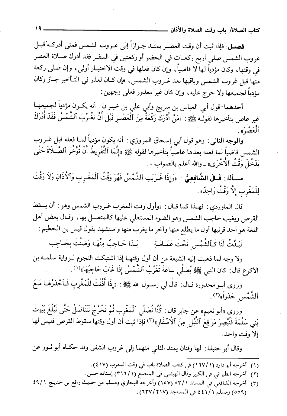وَلَا وَجْهَ لِمَا ذَهَبَتْ إِلَيْهِ الشِّيعَةُ مِنْ أَنَّ أَوَّلَ وَقْتِهَا إِذَا اشْتَبَكَتِ النُّجُومُ لِرِوَايَةِ سَلَمَةَ بْنِ الْأَكْوَعِ قَالَ: كَانَ النَّبِيُّ - صَلَّى اللَّهُ عَلَيْهِ وَسَلَّم َ - يُصَلِّي سَاعَةَ تَغْرُبُ الشَّمْسُ إِذَا غَابَ حَاجِبُهَا ".