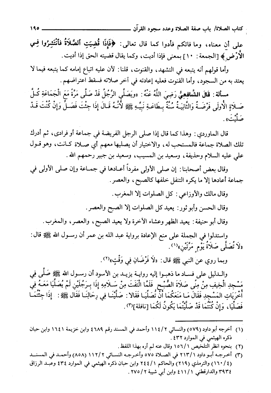 : قَالَ الشافعي رضي الله عنه: " وَيُصَلِّي الرَّجُلُ قَدْ صَلَّى مَرَّةً مَعَ الْجَمَاعَةِ كل صلاة الأولى فرضة وَالثَانِيَةُ سُنَّةٌ بِطَاعَةِ نَبِيِّهِ - صَلَّى اللَّهُ عَلَيْهِ وَسَلَّم َ - لِأَنَّهُ قَالَ إِذَا جِئْتَ فَصَلِّ وَإِنْ كُنْتَ قَدْ صَلَّيْتَ "