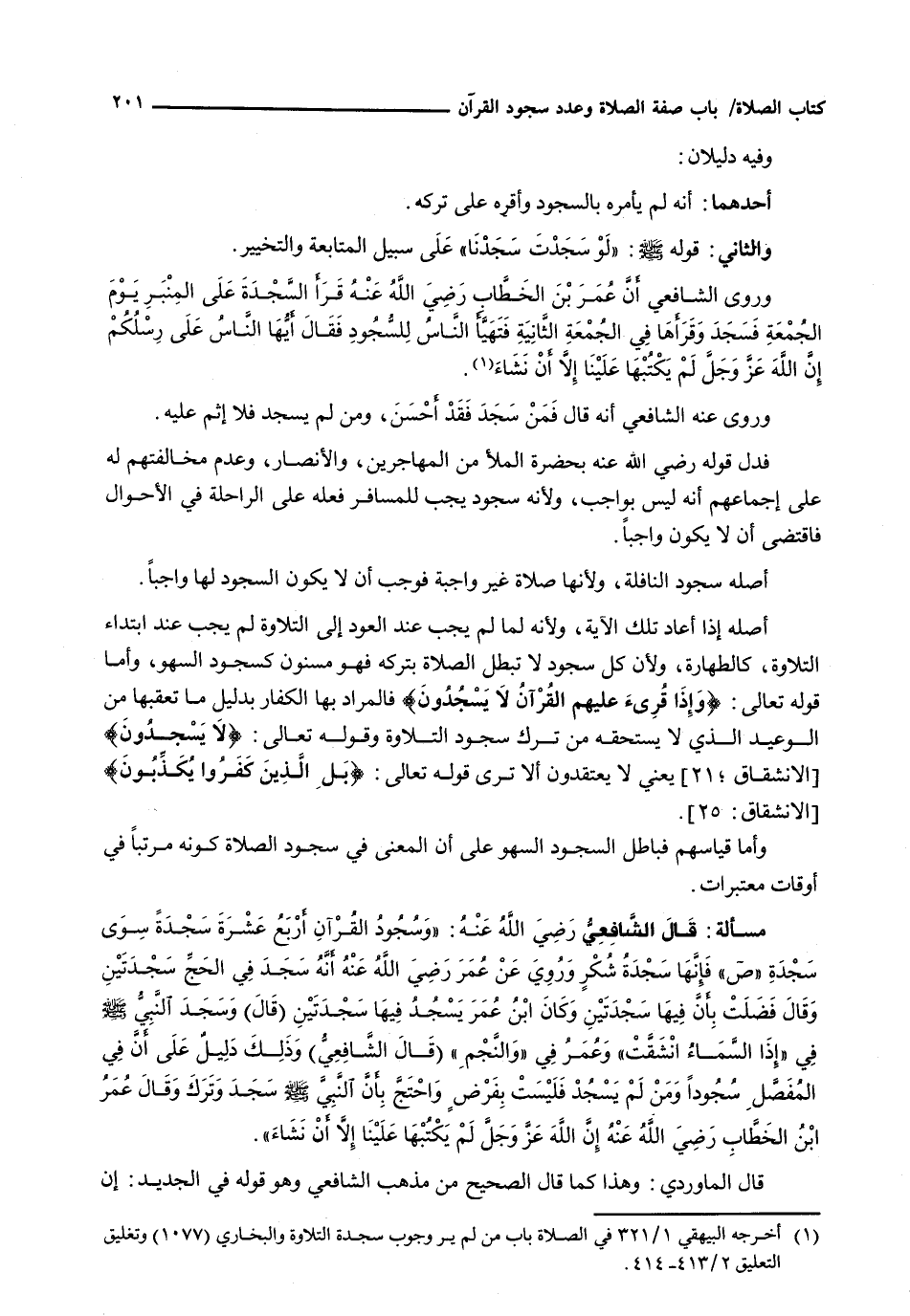 : قَالَ الشافعي رضي الله عنه: " وَسُجُودُ الْقُرْآنِ أَرْبَعَ عَشْرَةَ سَجْدَةً سِوَى سَجْدَةِ " ص " فَإِنَّهَا سَجْدَةُ شُكْرٍ وَرُوِيَ عَنْ عُمَرَ رَضِيَ اللَّهُ عَنْهُ أَنَّهُ سَجَدَ فِي الْحَجِّ سَجْدَتَيْنِ وَقَالَ فُضِّلَتْ بِأَنَّ فِيهَا سَجْدَتَيْنِ وَكَانَ ابْنُ عُمَرَ يَسْجُدُ فِيهَا سَجْدَتَيْنِ (قَالَ) وَسَجَدَ النبي - صَلَّى اللَّهُ عَلَيْهِ وَسَلَّم َ - في " إذا السماء انشقت " وعمر في " والنجم " (قال الشافعي) وَذَلِكَ دَلِيلٌ عَلَى أَنَّ فِي الْمُفَصَّلِ سُجُودًا ومن لم يسجد فليست بفرض وَاحْتَجَّ بِأَنَّ النَّبِيَّ - صَلَّى اللَّهُ عَلَيْهِ وَسَلَّم َ - سجد وترك وقال عمر ابن الخطاب رضي الله عنه إِنَّ اللَّهَ عَزَّ وَجَلَّ لَمْ يَكْتُبْهَا عَلَيْنَا إلا أن نشاء "