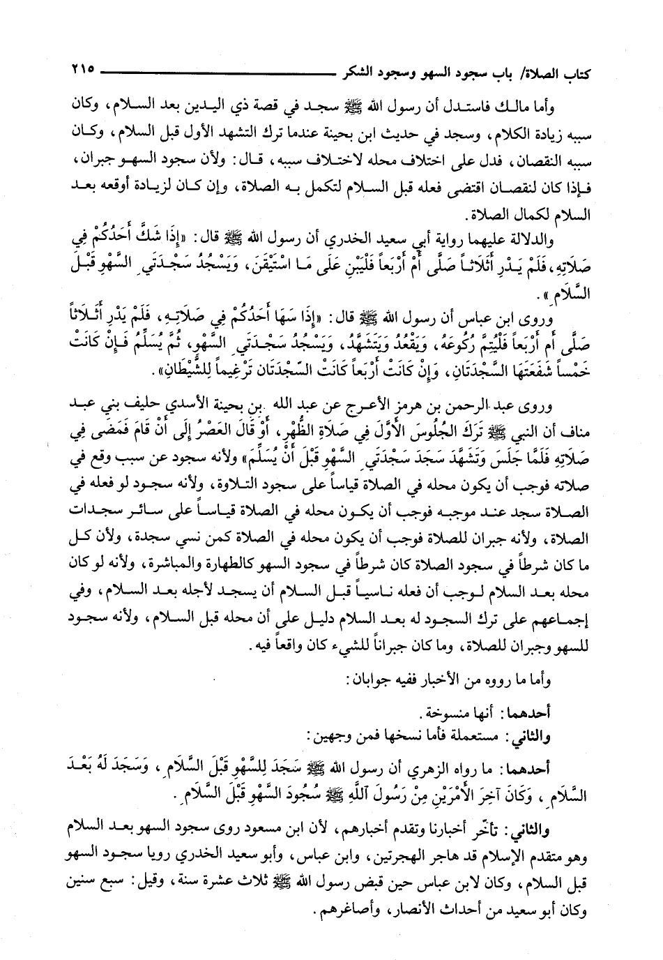 وَرَوَى عَبْدُ الرَّحْمَنِ بْنُ هُرْمُزَ الْأَعْرَجُ عَنْ عَبْدِ اللَّهِ بن بُحَيْنَةَ الْأَسَدِيِّ حَلِيفِ بَنِي عَبْدِ مَنَافٍ أَنَّ النبي - صَلَّى اللَّهُ عَلَيْهِ وَسَلَّم َ - تَرَكَ الْجُلُوسَ الْأَوَّلَ فِي صَلَاةِ الظُّهْرِ، أَوْ قَالَ الْعَصْرِ إِلَى أَنْ قَامَ فَمَضَى فِي صَلَاتِهِ فَلَمَّا جَلَسَ وَتَشَهَّدَ سَجَدَ سَجْدَتَيِ السَّهْوِ قَبْلَ أَنْ يُسَلِّمَ " وَلِأَنَّهُ سُجُودٌ عَنْ سَبَبٍ وَقَعَ فِي صَلَاتِهِ فَوَجَبَ أَنْ يَكُونَ مَحَلُّهُ فِي الصَّلَاةِ قِيَاسًا عَلَى سُجُودِ التِّلَاوَةِ، وَلِأَنَّهُ سجود لو فعله في الصلاة، سجد عنه مُوجِبِهِ فَوَجَبَ أَنْ يَكُونَ مَحَلُّهُ فِي الصَّلَاةِ قِيَاسًا عَلَى سَائِرِ سَجَدَاتِ الصَّلَاةِ وَلِأَنَّهُ جُبْرَانٌ لِلصَّلَاةِ فَوَجَبَ أَنْ يَكُونَ مَحَلُّهُ فِي الصَّلَاةِ كَمَنْ نَسِيَ سَجْدَةً، وَلِأَنَّ كُلَّ مَا كَانَ شَرْطًا فِي سُجُودِ الصَّلَاةِ كَانَ شَرْطًا فِي سُجُودِ السَّهْوِ كَالطَّهَارَةِ وَالْمُبَاشَرَةِ، وَلِأَنَّهُ لَوْ كَانَ مَحَلُّهُ بَعْدَ السَّلَامِ لَوَجَبَ إِنْ فَعَلَهُ نَاسِيًا قَبْلَ السَّلَامِ أَنْ يَسْجُدَ لِأَجْلِهِ بَعْدَ السَّلَامِ، وَفِي إِجْمَاعِهِمْ عَلَى تَرْكِ السُّجُودِ لَهُ بَعْدَ السَّلَامِ دَلِيلٌ عَلَى أَنَّ مَحَلَّهُ قَبْلَ السَّلَامِ، وَلِأَنَّهُ سُجُودٌ لِلسَّهْوِ وَجُبْرَانٌ لِلصَّلَاةِ، وَمَا كَانَ جُبْرَانًا لِلشَّيْءِ كَانَ وَاقِعًا فِيهِ
