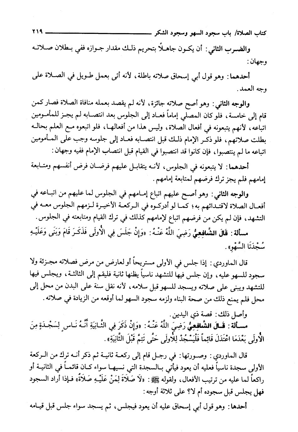 قَالَ الْمَاوَرْدِيُّ: وَصُورَتُهَا: فِي رَجُلٍ قَامَ إِلَى رَكْعَةٍ ثَانِيَةٍ ثُمَّ ذَكَرَ أَنَّهُ تَرَكَ مِنَ الرَّكْعَةِ الْأُولَى سَجْدَةً نَاسِيًا فَعَلَيْهِ أَنْ يَعُودَ فَيَأْتِيَ بِالسَّجْدَةِ الَّتِي نَسِيَهَا سَوَاءٌ كَانَ قَائِمًا فِي الثَّانِيَةِ أَوْ رَاكِعًا لِمَا عَلَيْهِ مِنْ تَرْتِيبِ الْأَفْعَالِ، وَلِقَوْلِهِ - صَلَّى اللَّهُ عَلَيْهِ وَسَلَّم َ -: " لَا صَلَاةَ لِمَنْ عَلَيْهِ صَلَاةٌ " فَإِذَا أَرَادَ السجود فهل يجلس قبل سجوده أما لَا؟ عَلَى ثَلَاثَةِ أَوْجُهٍ: