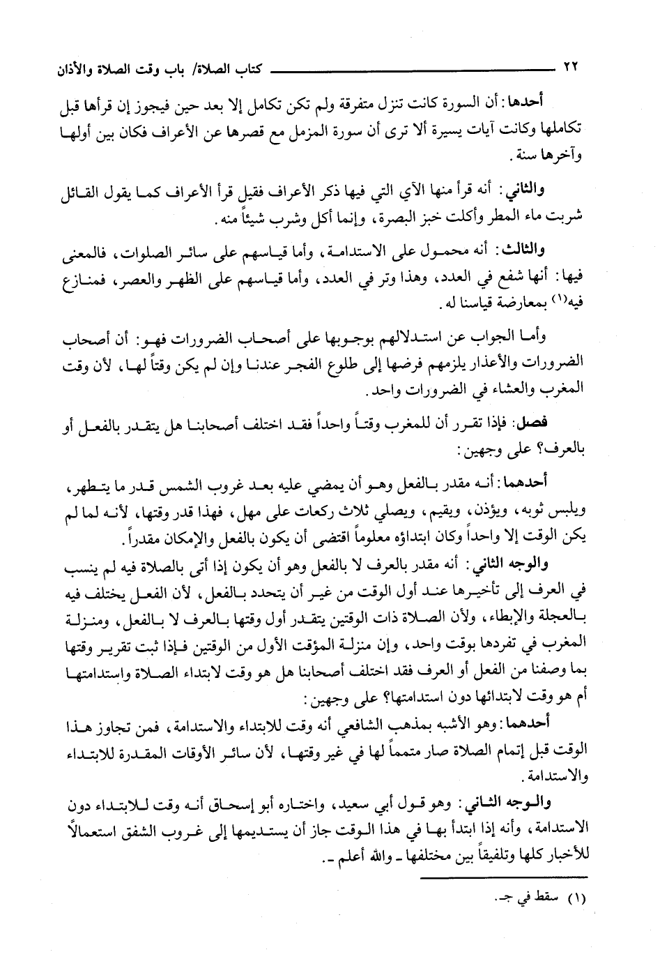 وَالْوَجْهُ الثَّانِي: أَنَّهُ مُقَدَّرٌ بِالْعُرْفِ لَا بِالْفِعْلِ وَهُوَ أَنْ يَكُونَ إِذَا أَتَى بِالصَّلَاةِ فِيهِ لَمْ يُنْسَبْ فِي الْعُرْفِ إِلَى تَأْخِيرِهَا عِنْدَ أَوَّلِ الْوَقْتِ مِنْ غَيْرِ أَنْ يَتَحَدَّدَ بِالْفِعْلِ، لِأَنَّ الْفِعْلَ يُخْتَلَفُ فِيهِ بِالْعَجَلَةِ وَالْإِبْطَاءِ، وَلِأَنَّ الصَّلَاةَ ذَاتَ الْوَقْتَيْنِ يَتَقَدَّرُ أَوَّلُ وَقْتِهَا بِالْعُرْفِ لَا بِالْفِعْلِ، وَمَنْزِلَةُ الْمَغْرِبِ فِي تَفَرُّدِهَا بِوَقْتٍ وَاحِدٍ، وَإِنَّ مَنْزِلَةَ الْمُؤَقَّتِ الْأَوَّلُ مِنَ الْوَقْتَيْنِ فَإِذَا ثَبَتَ تَقْرِيرُ وَقْتِهَا بِمَا وَصَفْنَا مِنَ الْفِعْلِ أَوِ الْعُرْفِ فَقَدِ اخْتَلَفَ أَصْحَابُنَا هَلْ هُوَ وَقْتٌ لِابْتِدَاءِ الصَّلَاةِ وَاسْتِدَامَتِهَا أَمْ هُوَ وَقْتٌ لِابْتِدَائِهَا دُونَ اسْتَدَامَتِهَا؟ عَلَى وَجْهَيْنِ: