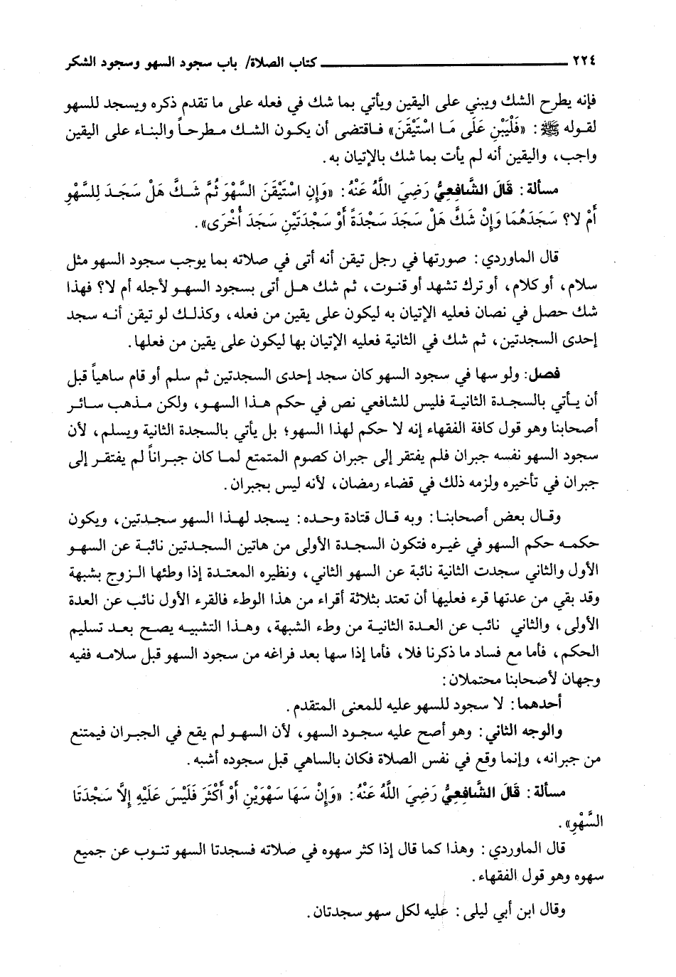 قَالَ الْمَاوَرْدِيُّ: صُورَتُهَا فِي رَجُلٍ تَيَقَّنَ أَنَّهُ أَتَى فِي صَلَاتِهِ بِمَا يُوجِبُ سُجُودَ السَّهْوِ مِثْلُ سَلَامٍ، أَوْ كَلَامٍ، أَوْ تَرْكِ تَشَهُّدٍ أَوْ قُنُوتٍ، ثُمَّ شَكَّ هَلْ أَتَى بِسُجُودِ السَّهْوِ لِأَجْلِهِ أَمْ لَا؟ فَهَذَا شَكٌّ حَصَلَ في نصان فَعَلَيْهِ الْإِتْيَانُ بِهِ لِيَكُونَ عَلَى يَقِينٍ مِنْ فِعْلِهِ، وَكَذَلِكَ لَوْ تَيَقَّنَ أَنَّهُ سَجَدَ إِحْدَى السَّجْدَتَيْنِ، ثُمَّ شَكَّ فِي الثَّانِيَةِ فَعَلَيْهِ الْإِتْيَانُ بِهَا لِيَكُونَ عَلَى يَقِينٍ مِنْ فِعْلِهَا